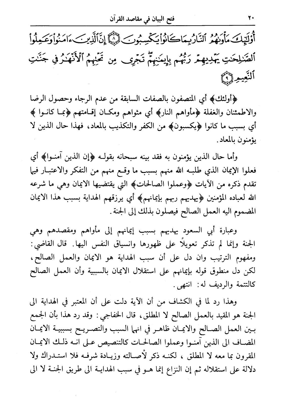 أُولَئِكَ مَأْوَاهُمُ النَّارُ بِمَا كَانُوا يَكْسِبُونَ (8) إِنَّ الَّذِينَ آمَنُوا وَعَمِلُوا الصَّالِحَاتِ يَهْدِيهِمْ رَبُّهُمْ بِإِيمَانِهِمْ تَجْرِي مِنْ تَحْتِهِمُ الْأَنْهَارُ فِي جَنَّاتِ النَّعِيمِ (9)