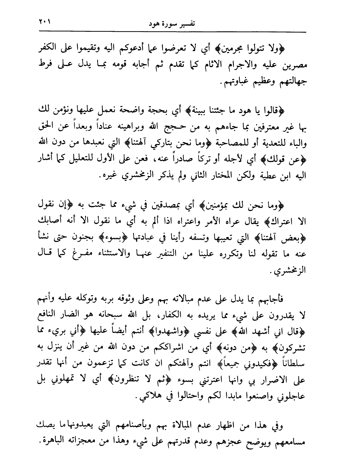 فأجابهم بما يدل على عدم مبالاته بهم وعلى وثوقه بربه وتوكله عليه وأنهم لا يقدرون على شيء مما يريده به الكفار، بل الله سبحانه هو الضار النافع (قال إني أشهد الله) على نفسي (واشهدوا) أنتم أيضاً عليها (أني بريء مما تشركون) به