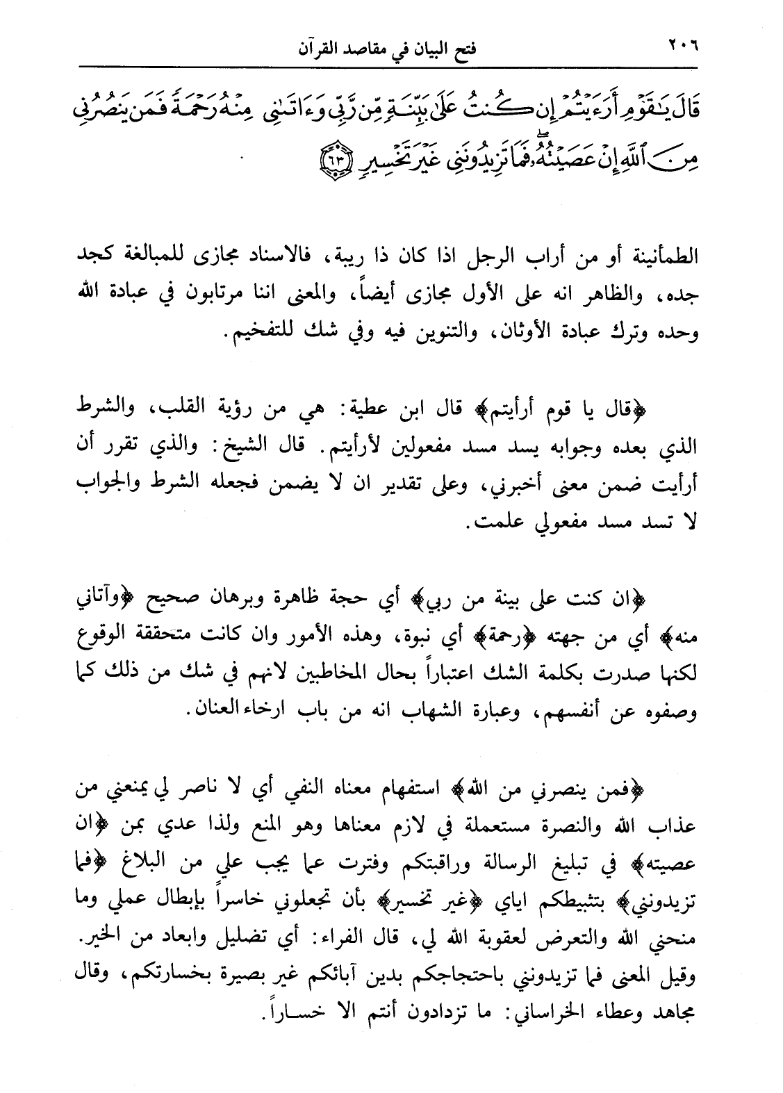 قَالَ يَا قَوْمِ أَرَأَيْتُمْ إِنْ كُنْتُ عَلَى بَيِّنَةٍ مِنْ رَبِّي وَآتَانِي مِنْهُ رَحْمَةً فَمَنْ يَنْصُرُنِي مِنَ اللَّهِ إِنْ عَصَيْتُهُ فَمَا تَزِيدُونَنِي غَيْرَ تَخْسِيرٍ (63)