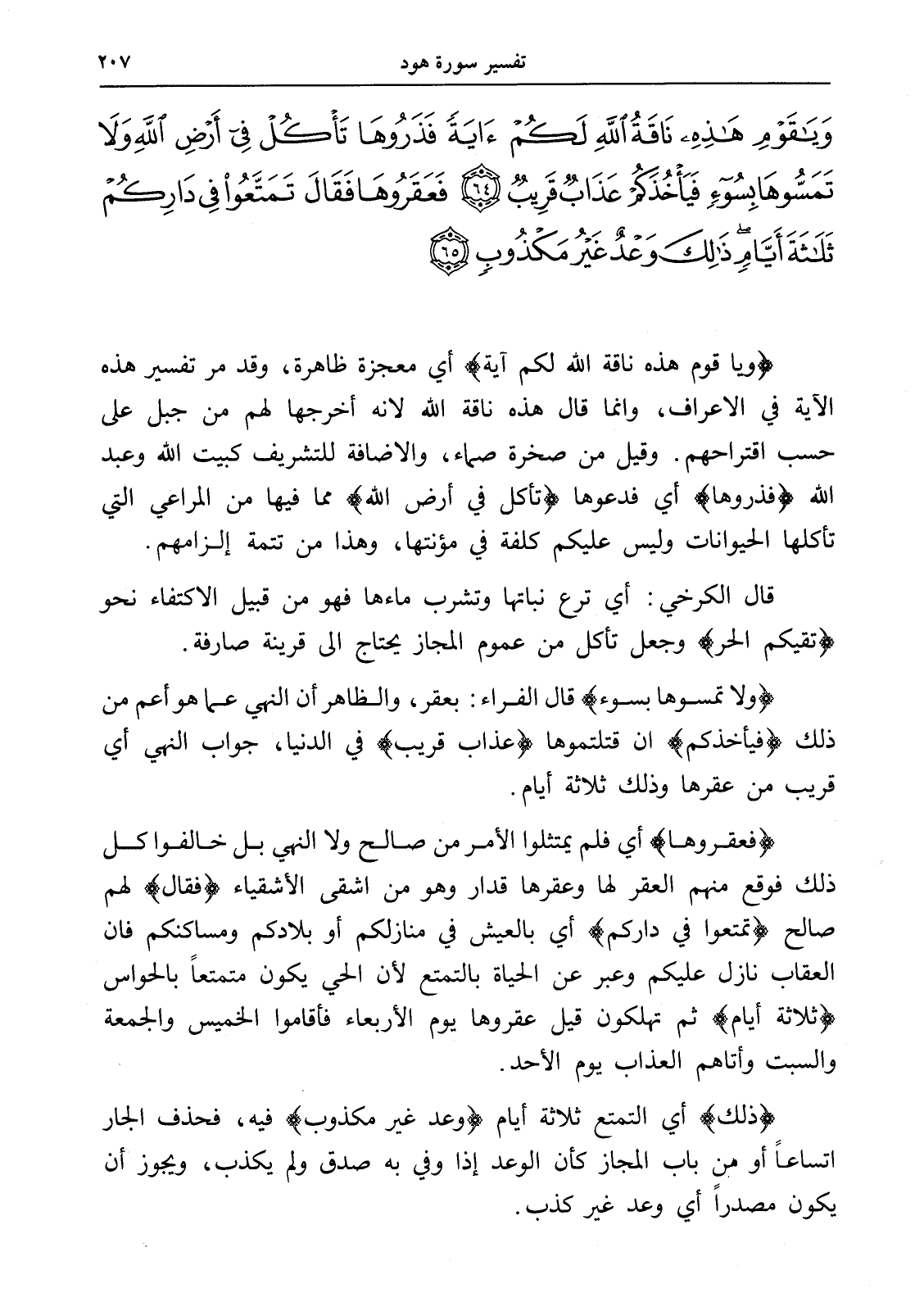 وَيَا قَوْمِ هَذِهِ نَاقَةُ اللَّهِ لَكُمْ آيَةً فَذَرُوهَا تَأْكُلْ فِي أَرْضِ اللَّهِ وَلَا تَمَسُّوهَا بِسُوءٍ فَيَأْخُذَكُمْ عَذَابٌ قَرِيبٌ (64) فَعَقَرُوهَا فَقَالَ تَمَتَّعُوا فِي دَارِكُمْ ثَلَاثَةَ أَيَّامٍ ذَلِكَ وَعْدٌ غَيْرُ مَكْذُوبٍ (65)