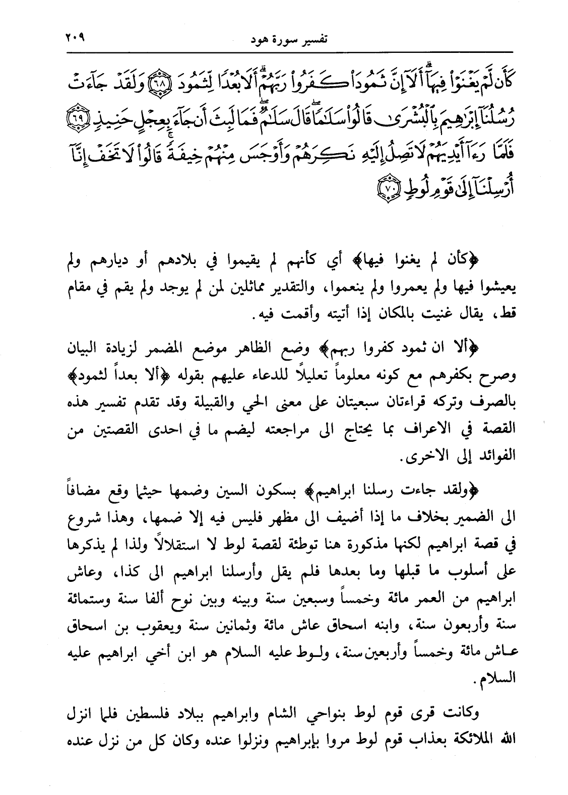 كَأَنْ لَمْ يَغْنَوْا فِيهَا أَلَا إِنَّ ثَمُودَ كَفَرُوا رَبَّهُمْ أَلَا بُعْدًا لِثَمُودَ (68) وَلَقَدْ جَاءَتْ رُسُلُنَا إِبْرَاهِيمَ بِالْبُشْرَى قَالُوا سَلَامًا قَالَ سَلَامٌ فَمَا لَبِثَ أَنْ جَاءَ بِعِجْلٍ حَنِيذٍ (69) فَلَمَّا رَأَى أَيْدِيَهُمْ لَا تَصِلُ إِلَيْهِ نَكِرَهُمْ وَأَوْجَسَ مِنْهُمْ خِيفَةً قَالُوا لَا تَخَفْ إِنَّا أُرْسِلْنَا إِلَى قَوْمِ لُوطٍ (70)