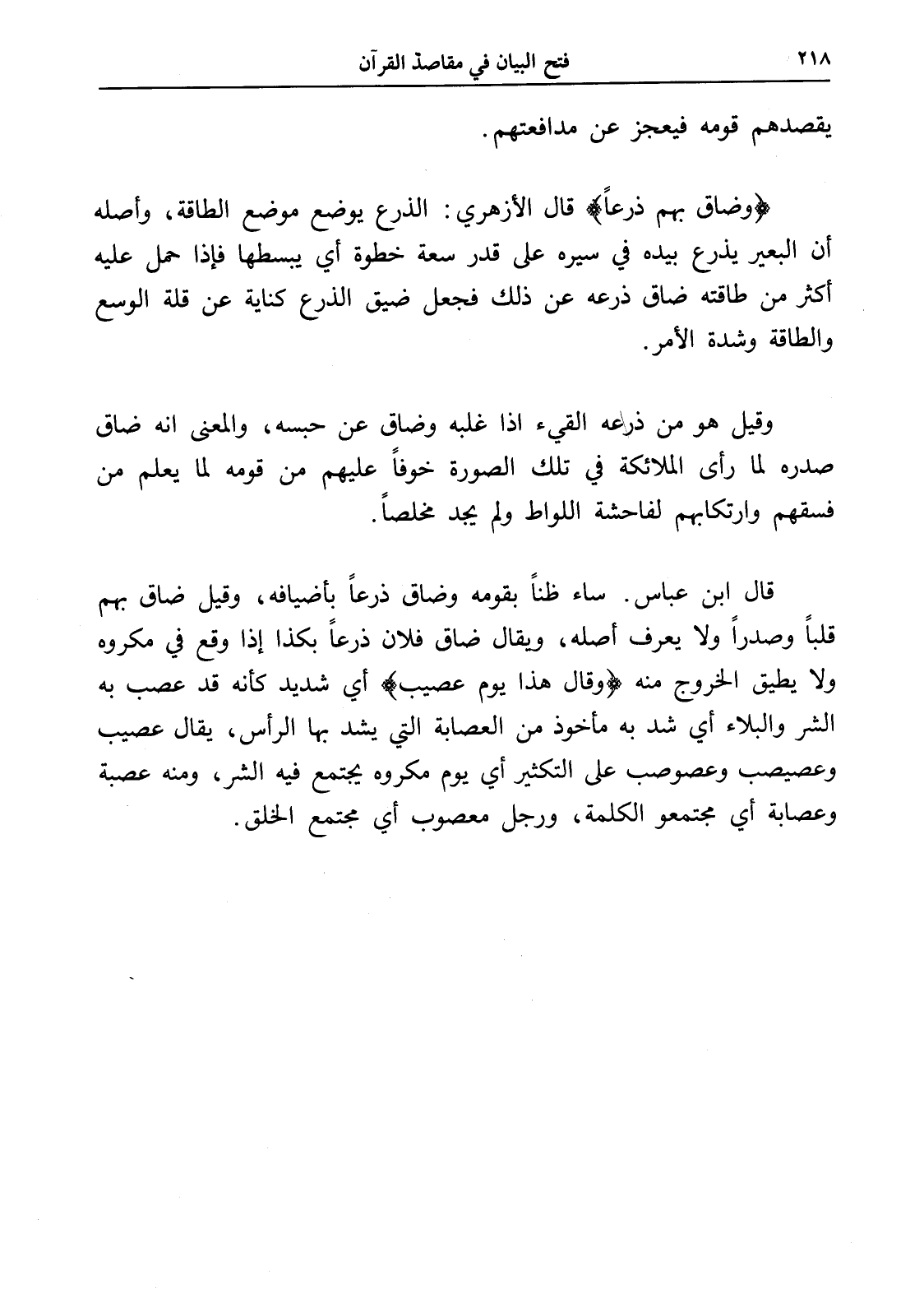 قال ابن عباس. ساء ظناً بقومه وضاق ذرعاً بأضيافه، وقيل ضاق بهم قلباً وصدراً ولا يعرف أصله، ويقال ضاق فلان ذرعاً بكذا إذا وقع في مكروه ولا يطيق الخروج منه (وقال هذا يوم عصيب) أي شديد كأنه قد عصب به الشر والبلاء أي شد به مأخوذ من العصابة التي يشد بها الرأس، يقال عصيب وعصيصب وعصوصب على التكثير أي يوم مكروه يجتمع فيه الشر، ومنه عصبة وعصابة أي مجتمعو الكلمة، ورجل معصوب أي مجتمع الخلق.