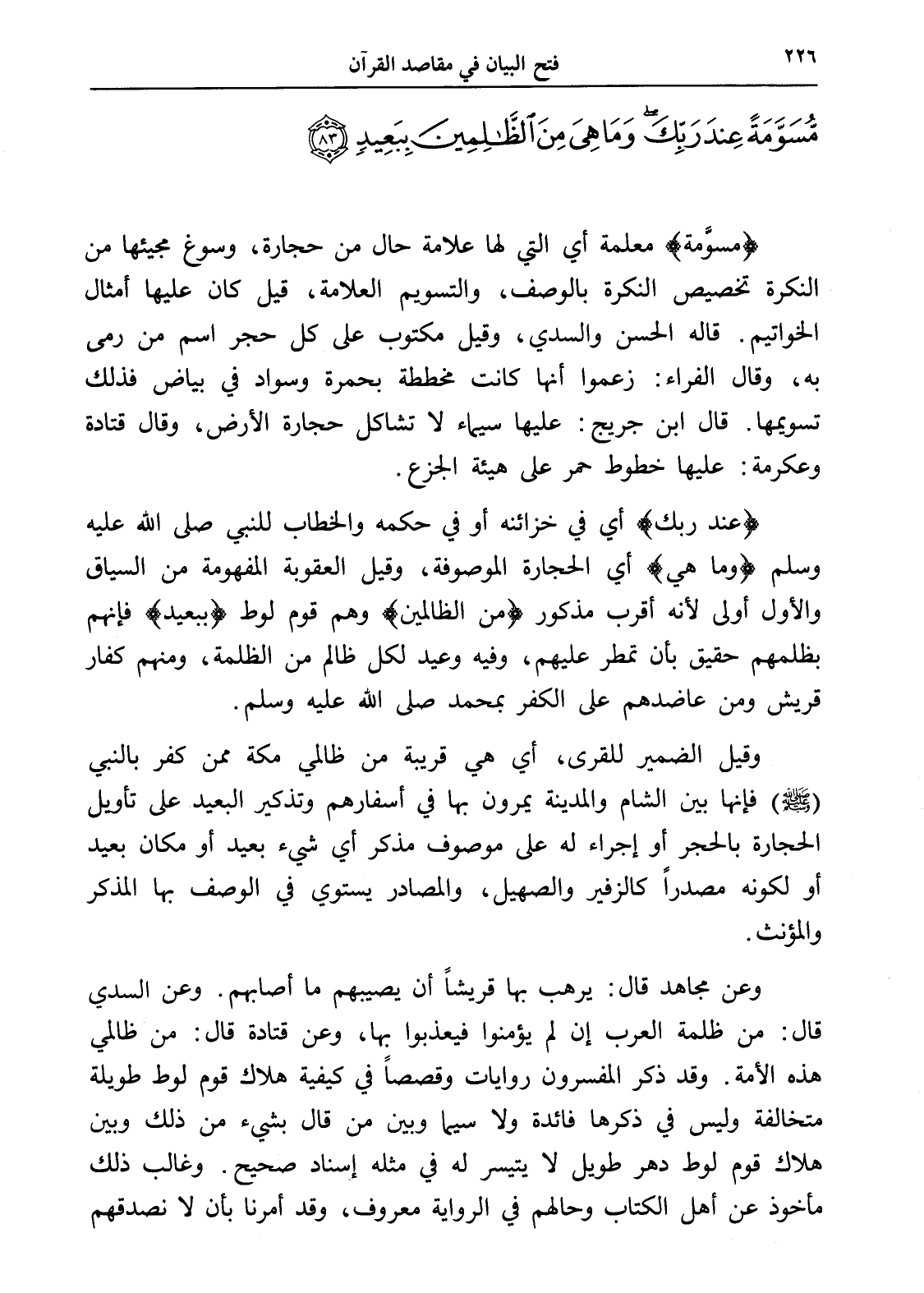 مُسَوَّمَةً عِنْدَ رَبِّكَ وَمَا هِيَ مِنَ الظَّالِمِينَ بِبَعِيدٍ (83)