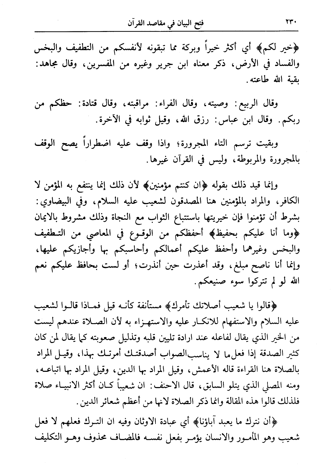 (خير لكم) أي أكثر خيراً وبركة مما تبقونه لأنفسكم من التطفيف والبخس والفساد في الأرض، ذكر معناه ابن جرير وغيره من المفسرين، وقال مجاهد: بقية الله طاعته.