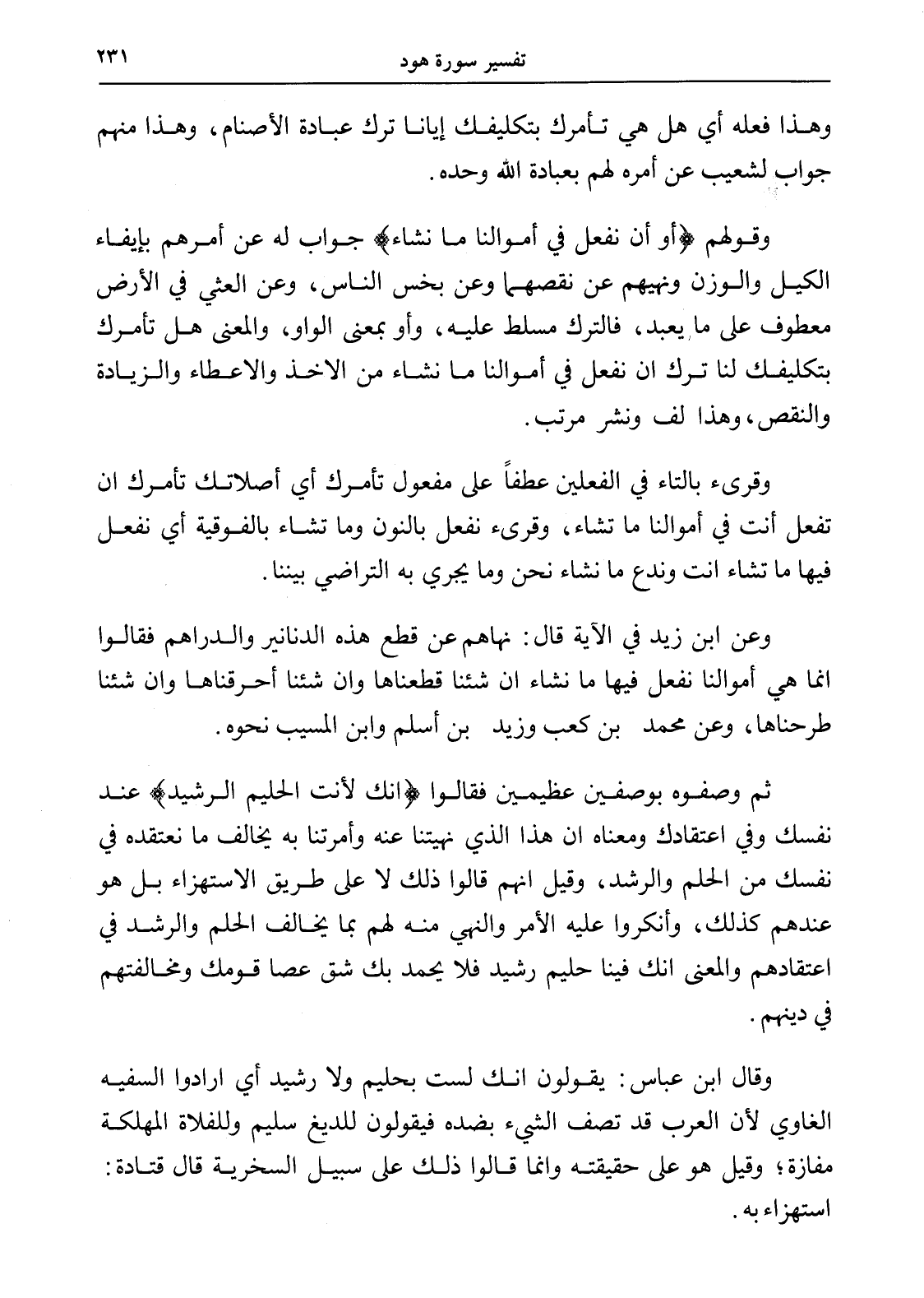 وقولهم (أو أن نفعل في أموالنا ما نشاء) جواب له عن أمرهم بإيفاء الكيل والوزن ونهيهم عن نقصهما وعن بخس الناس، وعن العثي في الأرض معطوف على ما يعبد، فالترك مسلط عليه، وأو بمعنى الواو، والمعنى هل تأمرك بتكليفك لنا ترك إن نفعل في أموالنا ما نشاء من الأخذ والإعطاء والزيادة والنقص، وهذا لف ونشر مرتب.