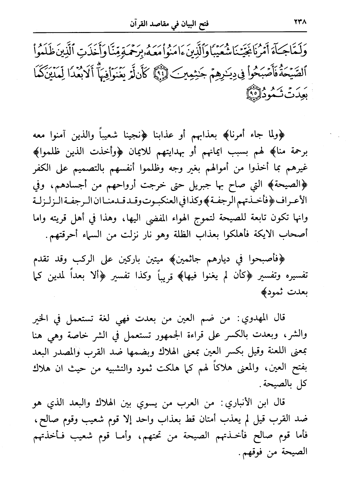 وَلَمَّا جَاءَ أَمْرُنَا نَجَّيْنَا شُعَيْبًا وَالَّذِينَ آمَنُوا مَعَهُ بِرَحْمَةٍ مِنَّا وَأَخَذَتِ الَّذِينَ ظَلَمُوا الصَّيْحَةُ فَأَصْبَحُوا فِي دِيَارِهِمْ جَاثِمِينَ (94) كَأَنْ لَمْ يَغْنَوْا فِيهَا أَلَا بُعْدًا لِمَدْيَنَ كَمَا بَعِدَتْ ثَمُودُ (95)