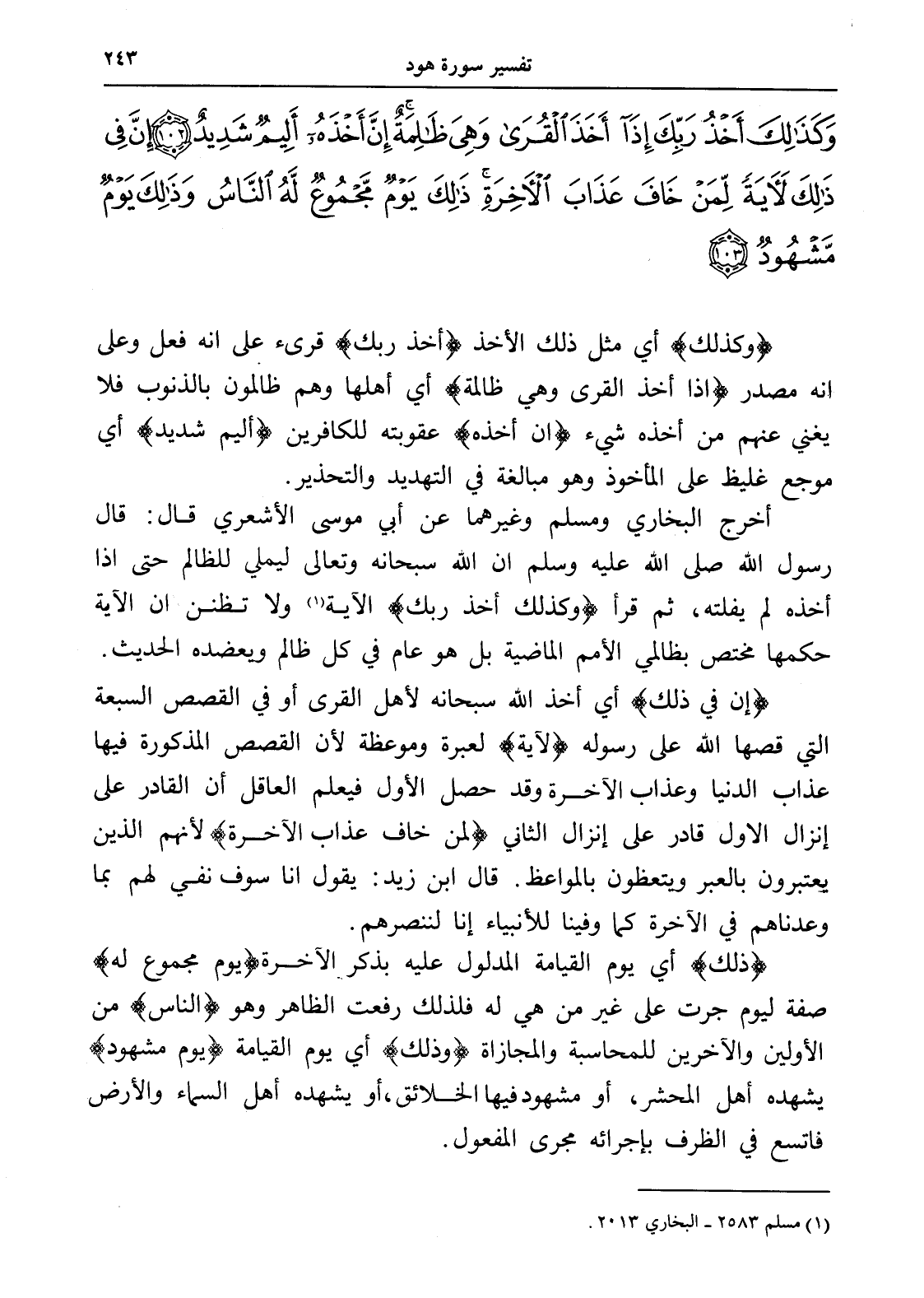 وَكَذَلِكَ أَخْذُ رَبِّكَ إِذَا أَخَذَ الْقُرَى وَهِيَ ظَالِمَةٌ إِنَّ أَخْذَهُ أَلِيمٌ شَدِيدٌ (102) إِنَّ فِي ذَلِكَ لَآيَةً لِمَنْ خَافَ عَذَابَ الْآخِرَةِ ذَلِكَ يَوْمٌ مَجْمُوعٌ لَهُ النَّاسُ وَذَلِكَ يَوْمٌ مَشْهُودٌ (103)