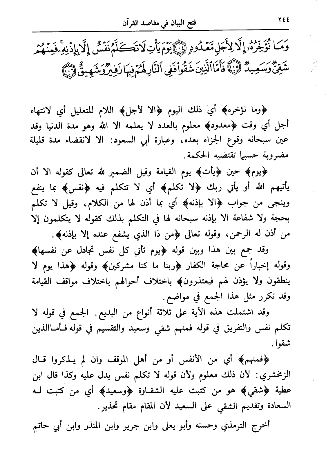وَمَا نُؤَخِّرُهُ إِلَّا لِأَجَلٍ مَعْدُودٍ (104) يَوْمَ يَأْتِ لَا تَكَلَّمُ نَفْسٌ إِلَّا بِإِذْنِهِ فَمِنْهُمْ شَقِيٌّ وَسَعِيدٌ (105) فَأَمَّا الَّذِينَ شَقُوا فَفِي النَّارِ لَهُمْ فِيهَا زَفِيرٌ وَشَهِيقٌ (106)