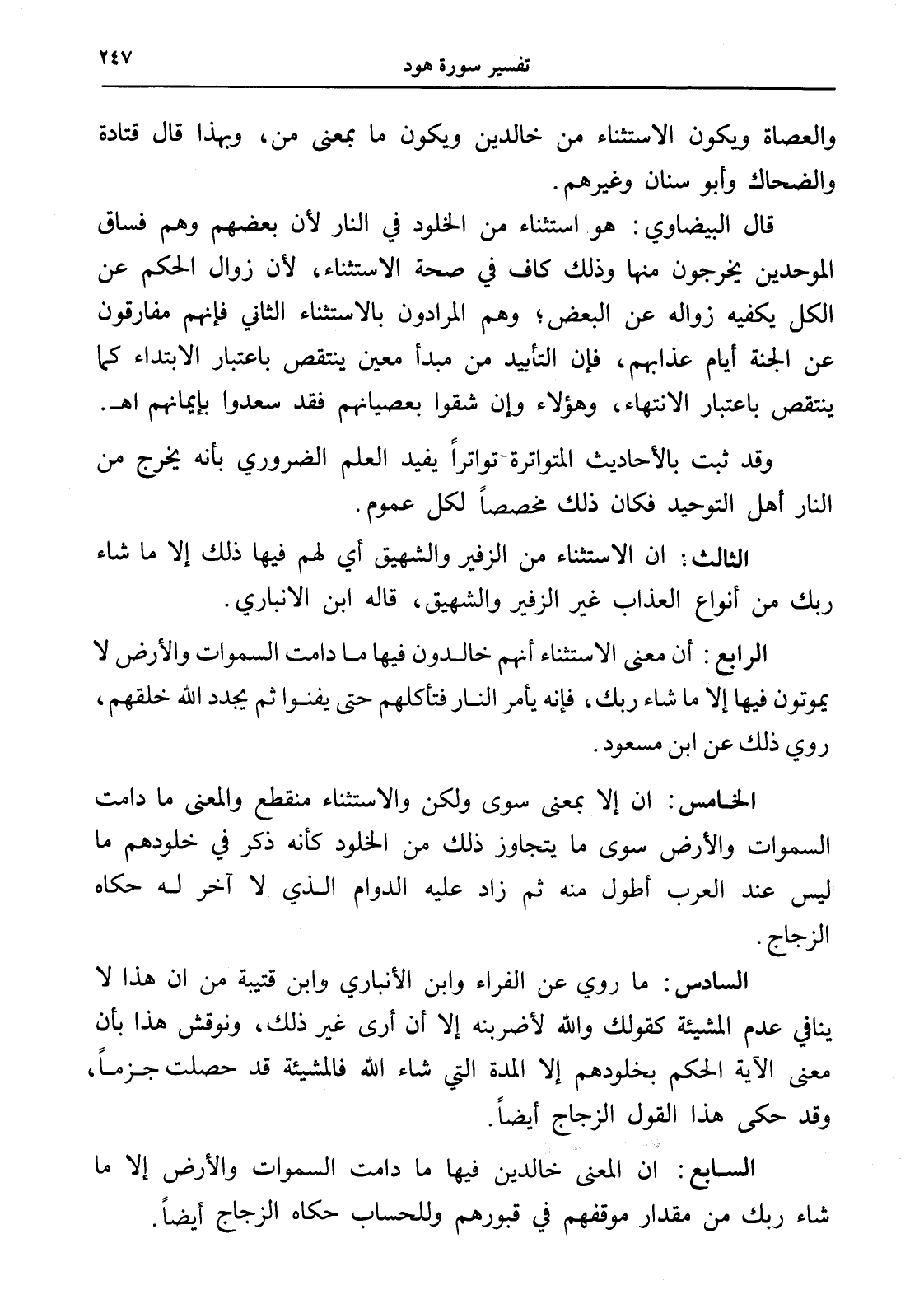 السادس: ما روي عن الفراء وابن الأنباري وابن قتيبة من أن هذا لا ينافي عدم المشيئة كقولك والله لأضربنه إلا أن أرى غير ذلك، ونوقش هذا بأن معنى الآية الحكم بخلودهم إلا المدة التي شاء الله فالمشيئة قد حصلت جزماً، وقد حكى هذا القول الزجاج أيضاً.