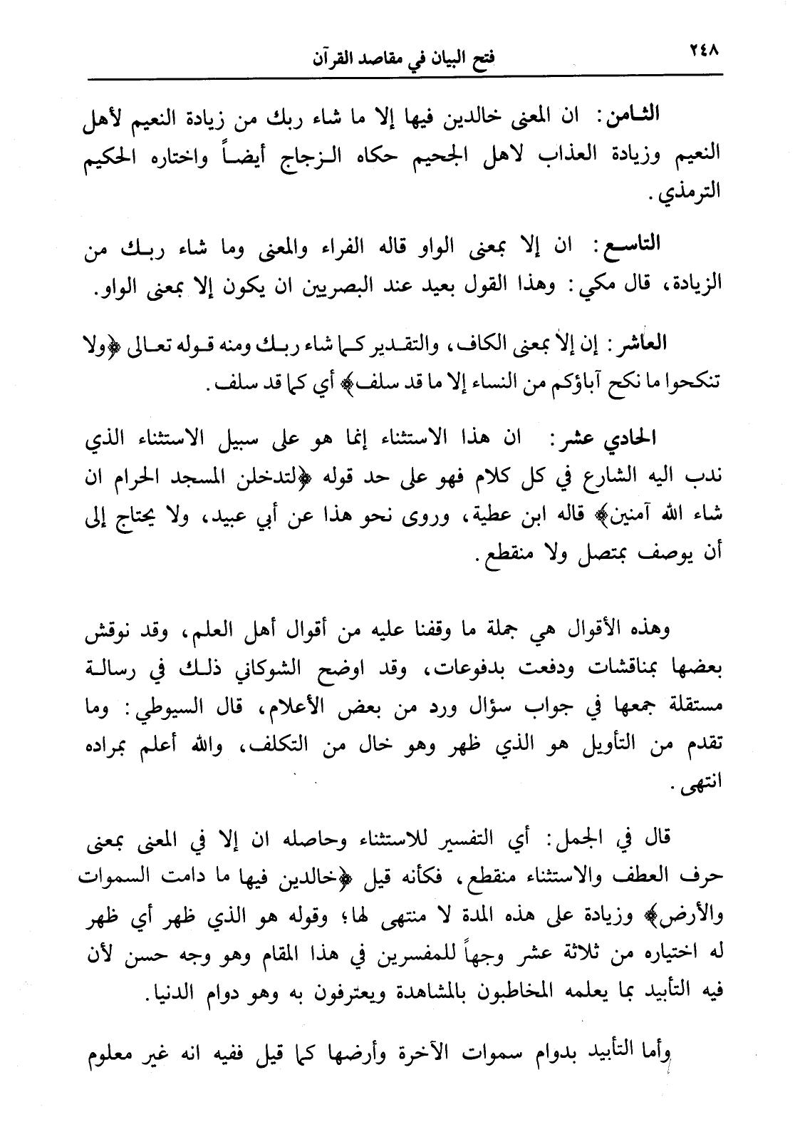 التاسع: أن إلا بمعنى الواو قاله الفراء والمعنى وما شاء ربك من الزيادة، قال مكي: وهذا القول بعيد عند البصريين أن يكون إلا بمعنى الواو.