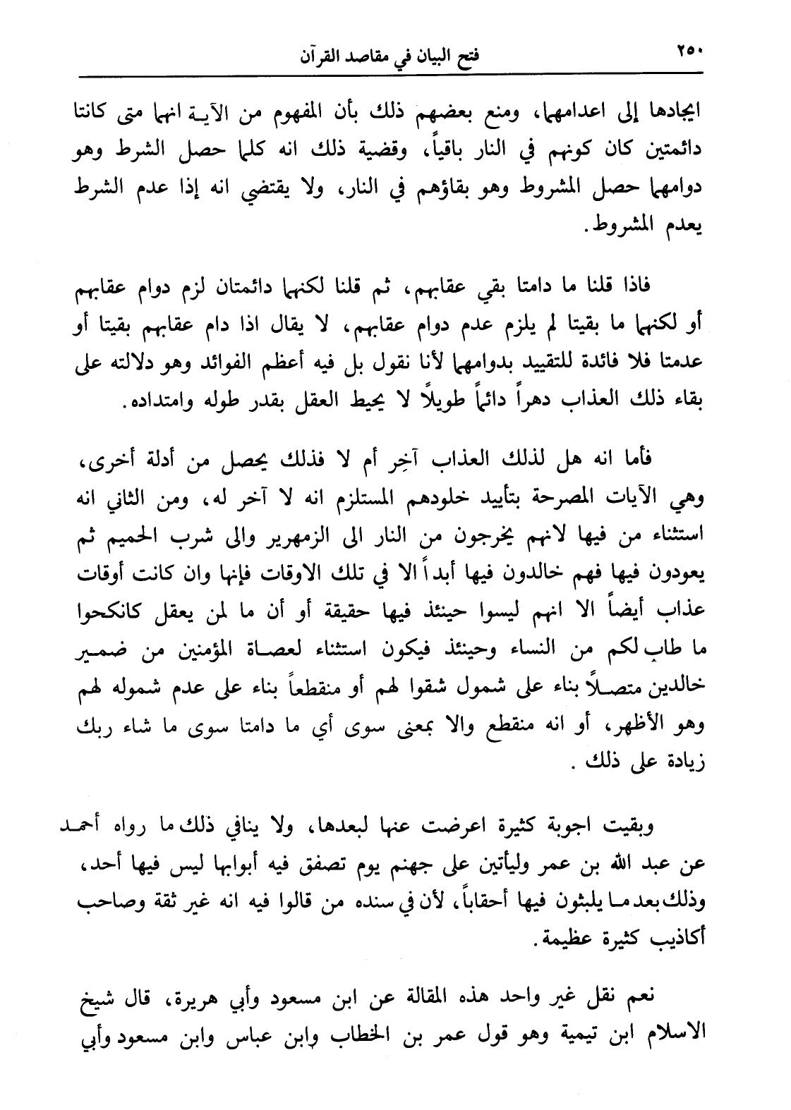 وبقيت أجوبة كثيرة أعرضت عنها لبعدها، ولا ينافي ذلك ما رواه أحمد عن عبد الله بن عمر وليأتين على جهنم يوم تصفق فيه أبوابها ليس فيها أحد، وذلك بعد ما يلبثون فيها أحقاباً، لأن في سنده من قالوا فيه أنه غير ثقة وصاحب أكاذيب كثيرة عظيمة.