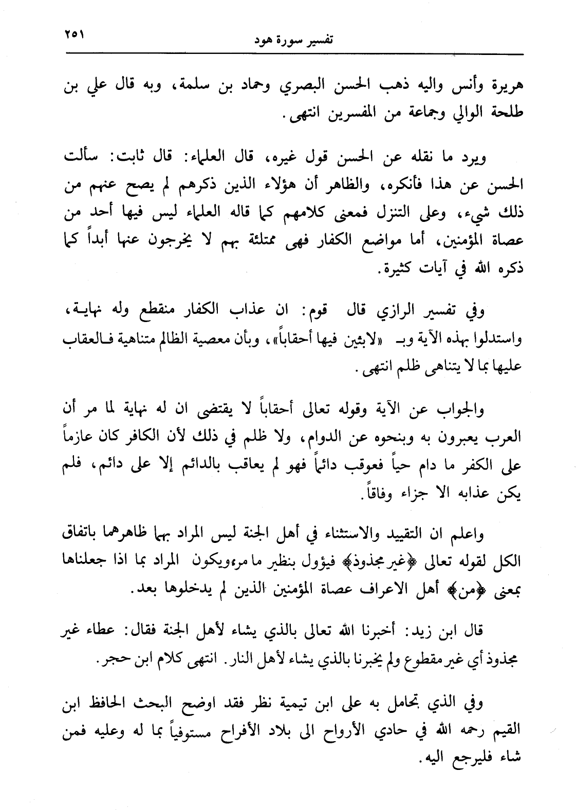 وفي تفسير الرازي قال قوم: أن عذاب الكفار منقطع وله نهاية، واستدلوا بهذه الآية وبـ " لابثين فيها أحقاباً "، وبأن معصية الظالم متناهية فالعقاب عليها بما لا يتناهى ظلم انتهى.