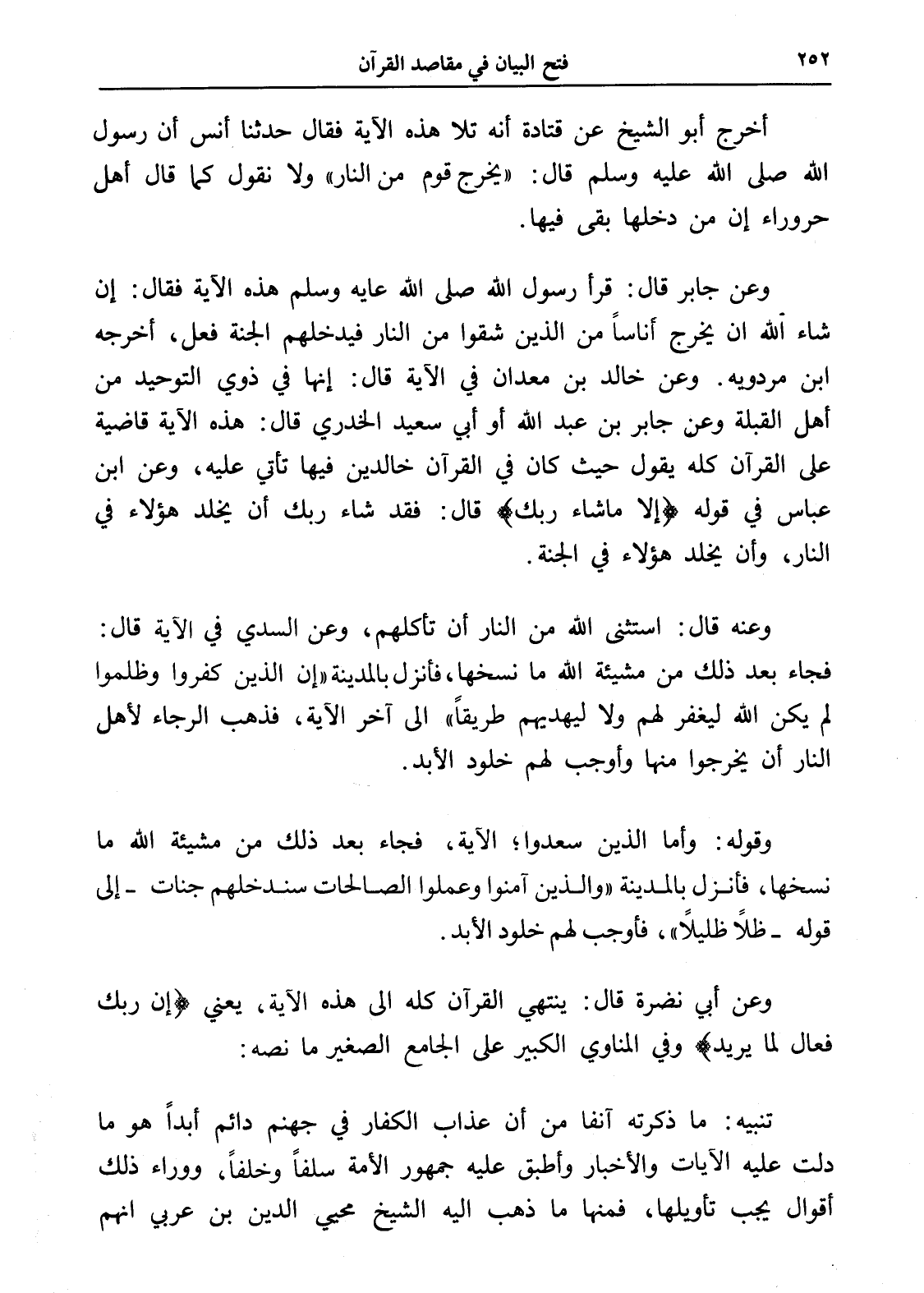 أخرج أبو الشيخ عن قتادة أنه تلا هذه الآية فقال حدثنا أنس أن رسول الله صلى الله عليه وسلم قال: " يخرج قوم من النار " ولا نقول كما قال أهل حروراء أن من دخلها بقى فيها.