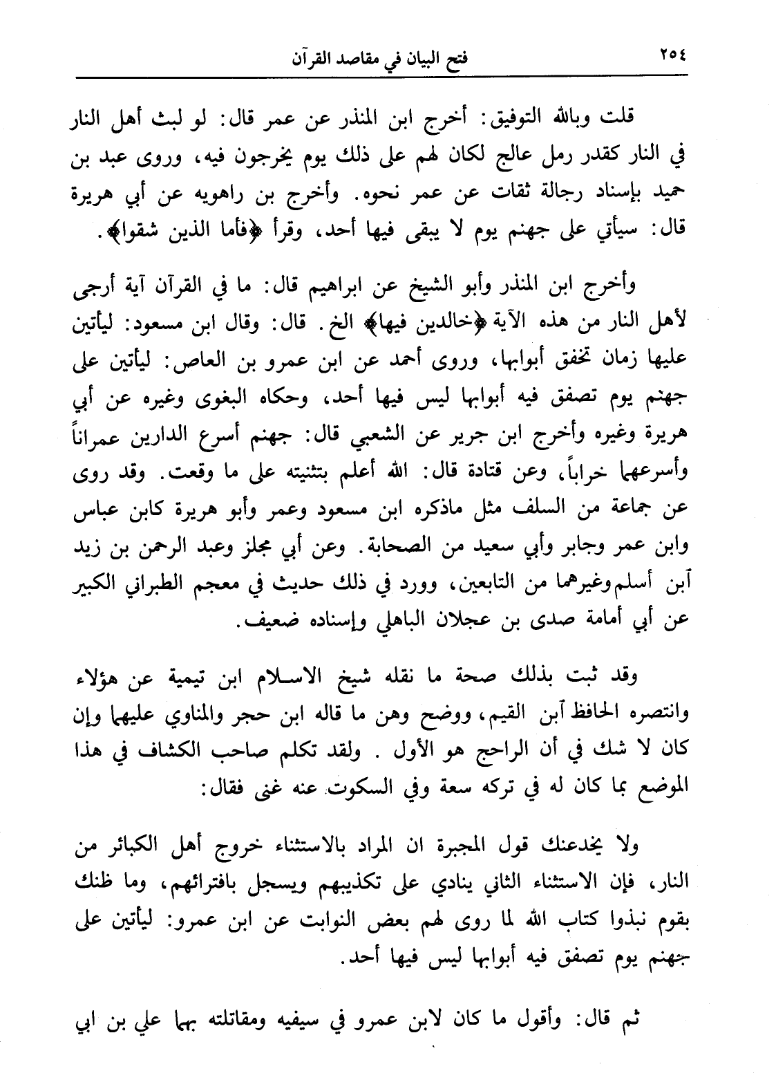 وأخرج ابن المنذر وأبو الشيخ عن إبراهيم قال: ما في القرآن آية أرجى لأهل النار من هذه الآية (خالدين فيها) الخ. قال: وقال ابن مسعود: ليأتين عليها زمان تخفق أبوابها، وروى أحمد عن ابن عمرو بن العاص: ليأتين على جهنم يوم تصفق فيه أبوابها ليس فيها أحد، وحكاه البغوى وغيره عن أبي هريرة وغيره وأخرج ابن جرير عن الشعبي قال: جهنم أسرع الدارين عمراناً وأسرعهما خراباً، وعن قتادة قال: الله أعلم بتثنيته على ما وقعت. وقد روى عن جماعة من السلف مثل ما ذكره ابن مسعود وعمر وأبو هريرة كابن عباس وابن عمر وجابر وأبي سعيد من الصحابة. وعن أبي مجلز وعبد الرحمن بن زيد ابن أسلم وغيرهما من التابعين، وورد في ذلك حديث في معجم الطبراني الكبير عن أبي أمامة صدى بن عجلان الباهلي وإسناده ضعيف.