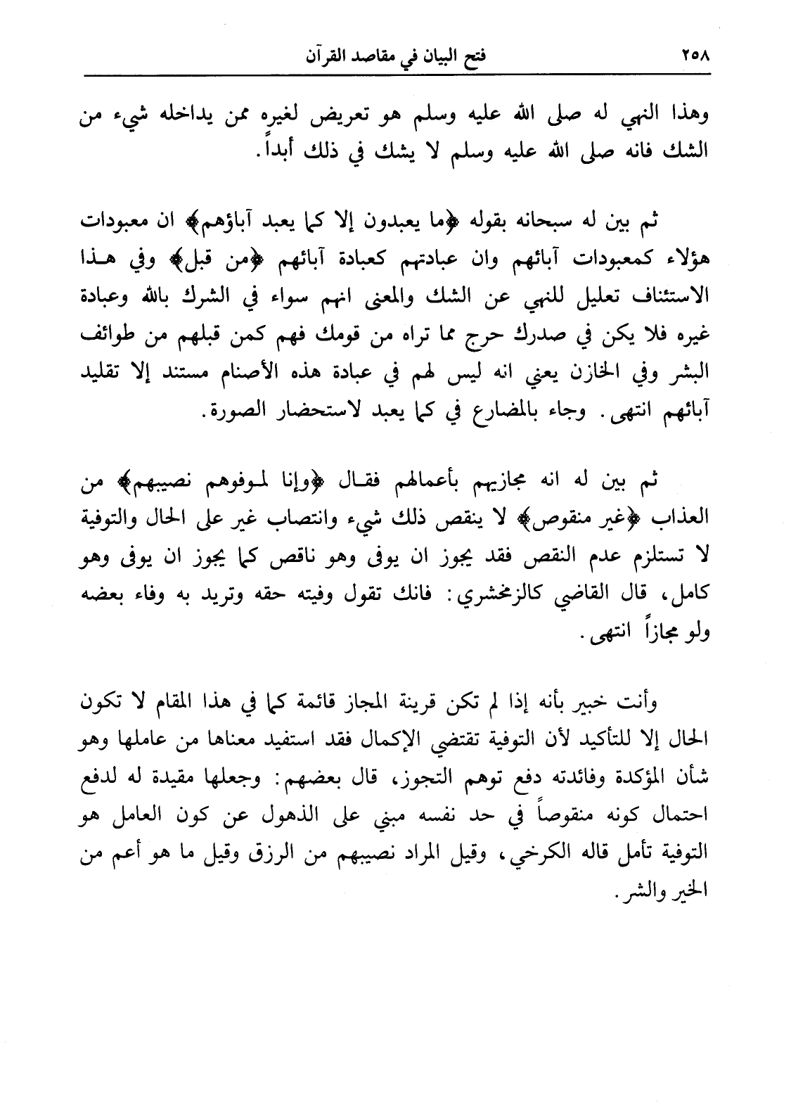 ثم بين له أنه مجازيهم بأعمالهم فقال (وإنا لموفوهم نصيبهم) من العذاب (غير منقوص) لا ينقص ذلك شيء وانتصاب غير على الحالى والتوفية لا تستلزم عدم النقص فقد يجوز أن يوفى وهو ناقص كما يجوز أن يوفى وهو كامل، قال القاضي كالزمخشري: فإنك تقول وفيته حقه وتريد به وفاء بعضه ولو مجازاً انتهى.
