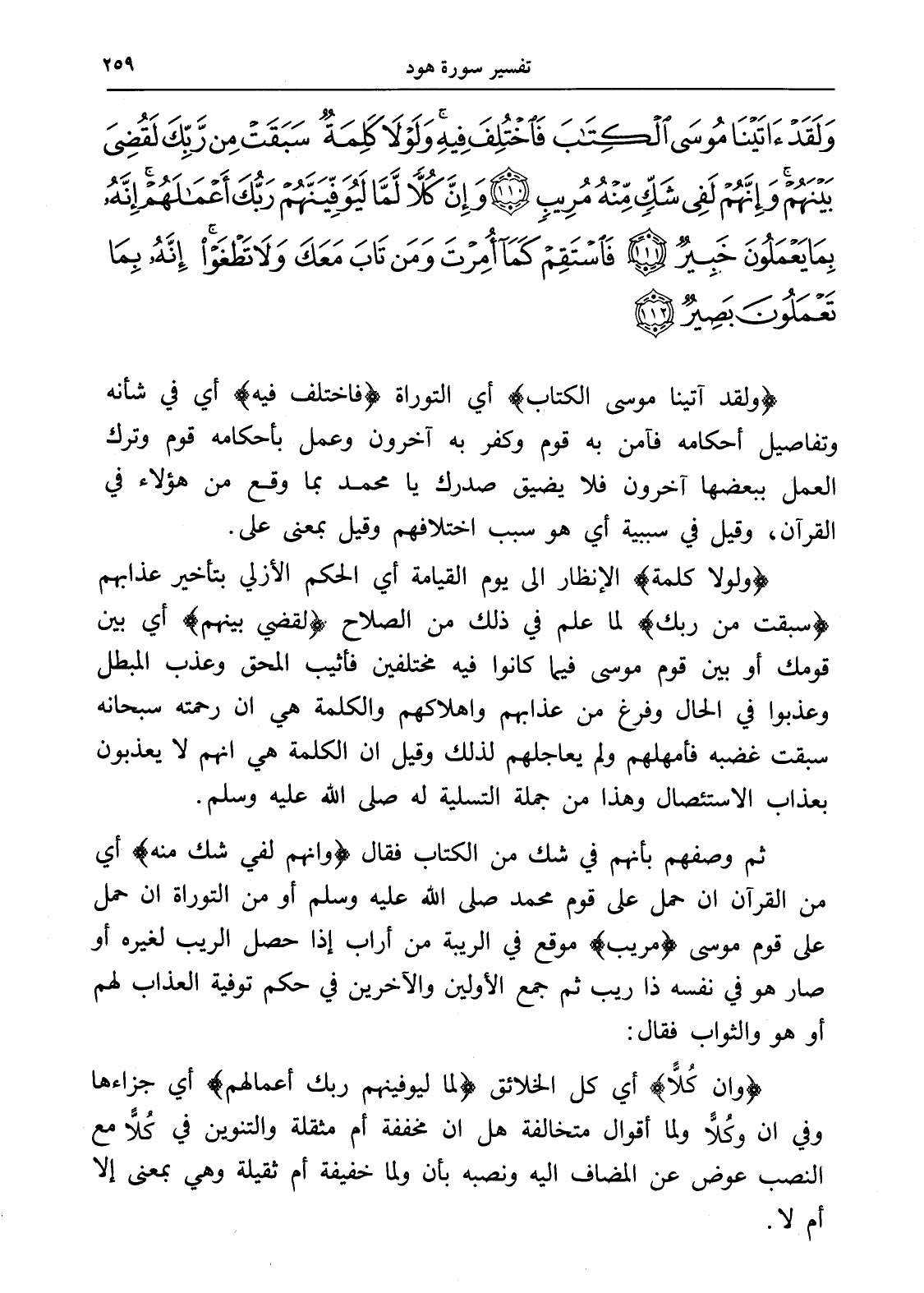 وَلَقَدْ آتَيْنَا مُوسَى الْكِتَابَ فَاخْتُلِفَ فِيهِ وَلَوْلَا كَلِمَةٌ سَبَقَتْ مِنْ رَبِّكَ لَقُضِيَ بَيْنَهُمْ وَإِنَّهُمْ لَفِي شَكٍّ مِنْهُ مُرِيبٍ (110) وَإِنَّ كُلًّا لَمَّا لَيُوَفِّيَنَّهُمْ رَبُّكَ أَعْمَالَهُمْ إِنَّهُ بِمَا يَعْمَلُونَ خَبِيرٌ (111) فَاسْتَقِمْ كَمَا أُمِرْتَ وَمَنْ تَابَ مَعَكَ وَلَا تَطْغَوْا إِنَّهُ بِمَا تَعْمَلُونَ بَصِيرٌ (112)