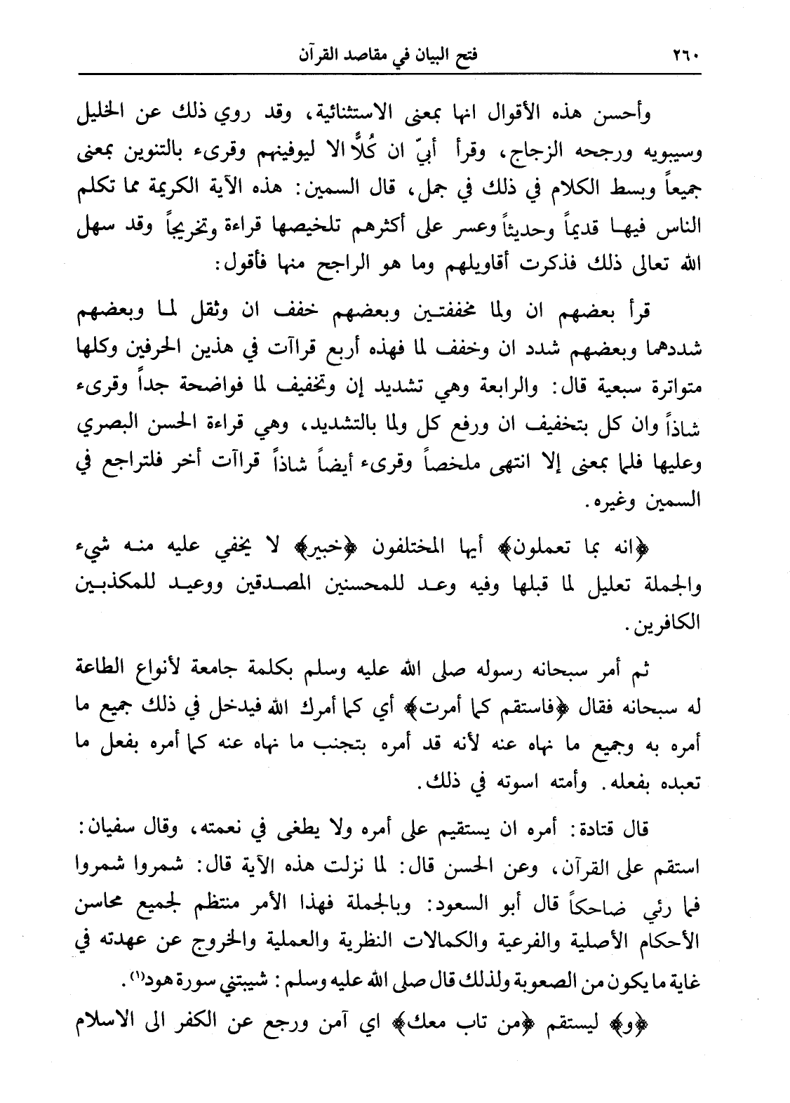 قال قتادة: أمره أن يستقيم على أمره ولا يطغى في نعمته، وقال سفيان: استقم على القرآن، وعن الحسن قال: لما نزلت هذه الآية قال: شمروا شمروا فما رئي ضاحكاً قال أبو السعود: وبالجملة فهذا الأمر منتظم لجميع محاسن الأحكام الأصلية والفرعية والكمالات النظرية والعملية والخروج عن عهدته في غاية ما يكون من الصعوبة ولذلك قال صلى الله عليه وسلم: شيبتني سورة هود (¬1).