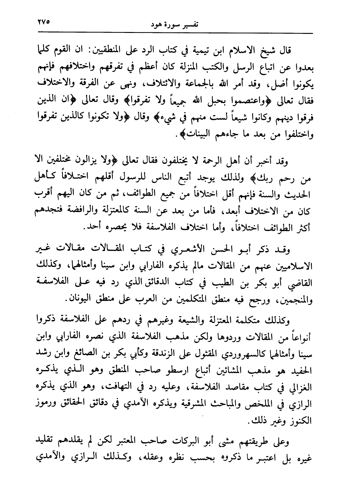 قال شيخ الإسلام ابن تيمية في كتاب الرد على المنطقين: أن القوم كلما بعدوا عن اتباع الرسل والكتب المنزلة كان أعظم في تفرقهم واختلافهم فإنهم يكونوا أضل، وقد أمر الله بالجماعة والائتلاف، ونهى عن الفرقة والاختلاف فقال تعالى (واعتصموا بحبل الله جميعاً ولا تفرقوا) وقال تعالى (إن الذين فرقوا دينهم وكانوا شيعاً لست منهم في شيء) وقال (ولا تكونوا كالذين تفرقوا واختلفوا من بعد ما جاءهم البينات).