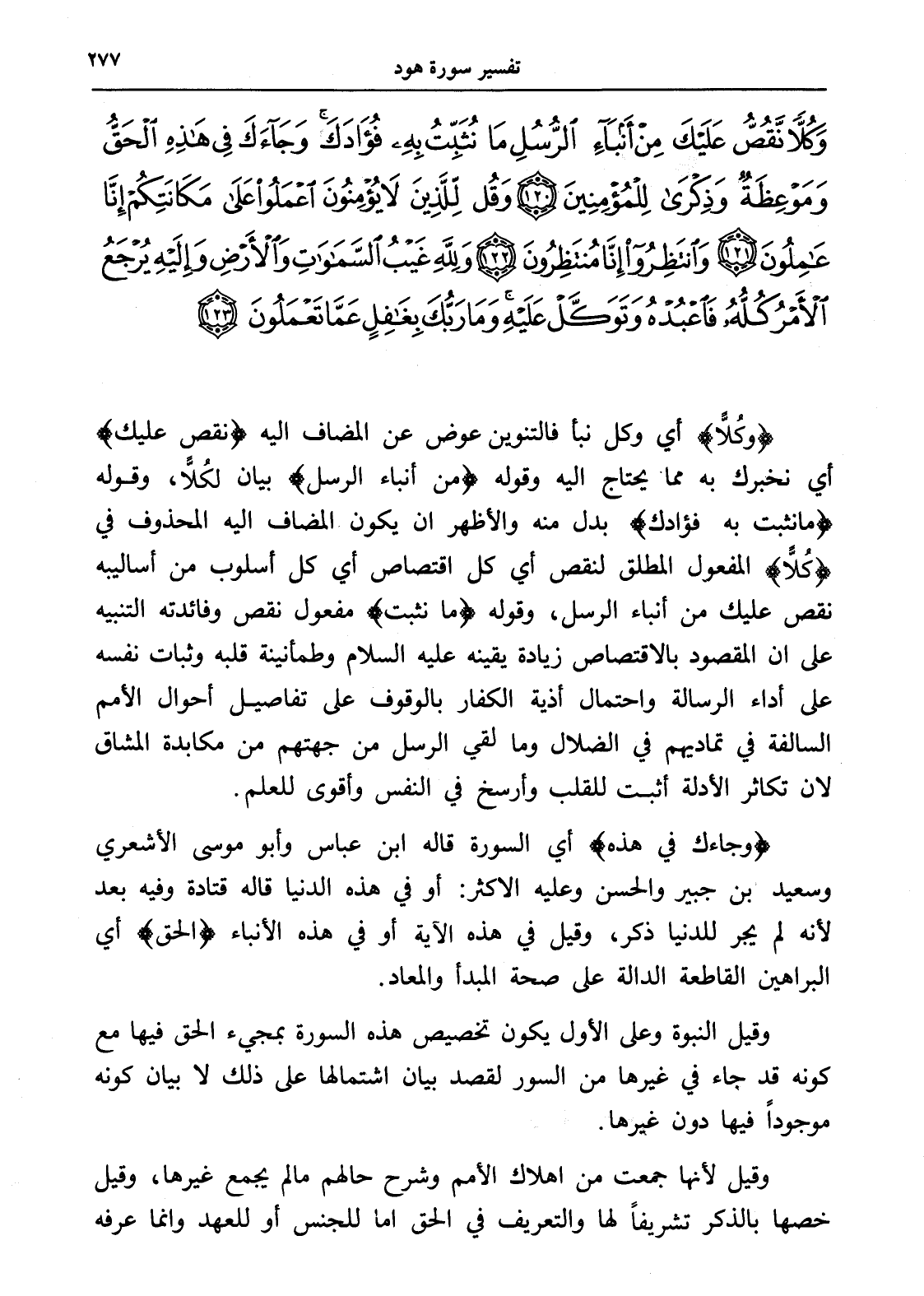 وَكُلاًّ نَقُصُّ عَلَيْكَ مِنْ أَنْبَاءِ الرُّسُلِ مَا نُثَبِّتُ بِهِ فُؤَادَكَ وَجَاءَكَ فِي هَذِهِ الْحَقُّ وَمَوْعِظَةٌ وَذِكْرَى لِلْمُؤْمِنِينَ (120) وَقُلْ لِلَّذِينَ لَا يُؤْمِنُونَ اعْمَلُوا عَلَى مَكَانَتِكُمْ إِنَّا عَامِلُونَ (121) وَانْتَظِرُوا إِنَّا مُنْتَظِرُونَ (122) وَلِلَّهِ غَيْبُ السَّمَاوَاتِ وَالْأَرْضِ وَإِلَيْهِ يُرْجَعُ الْأَمْرُ كُلُّهُ فَاعْبُدْهُ وَتَوَكَّلْ عَلَيْهِ وَمَا رَبُّكَ بِغَافِلٍ عَمَّا تَعْمَلُونَ (123)