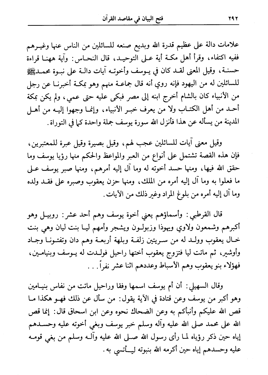وقال السهيلي: أن أم يوسف اسمها وفقا وراحيل ماتت من نفاس بنيامين وهو أكبر من يوسف وعن قتادة في الآية يقول: من سأل عن ذلك فهو هكذا ما قص الله عليكم وأنبأكم به وعن الضحاك نحوه وعن ابن إسحاق قال: إنما قص الله على محمد صلى الله عليه وآله وسلم خبر يوسف وبغي أخوته عليه وحسدهم إياه حين ذكر رؤياه لما رأى رسول الله صلى الله عليه وآله وسلم من بغي قومه عليه وحسدهم إياه حين أكرمه الله بنبوته ليأتسي به.