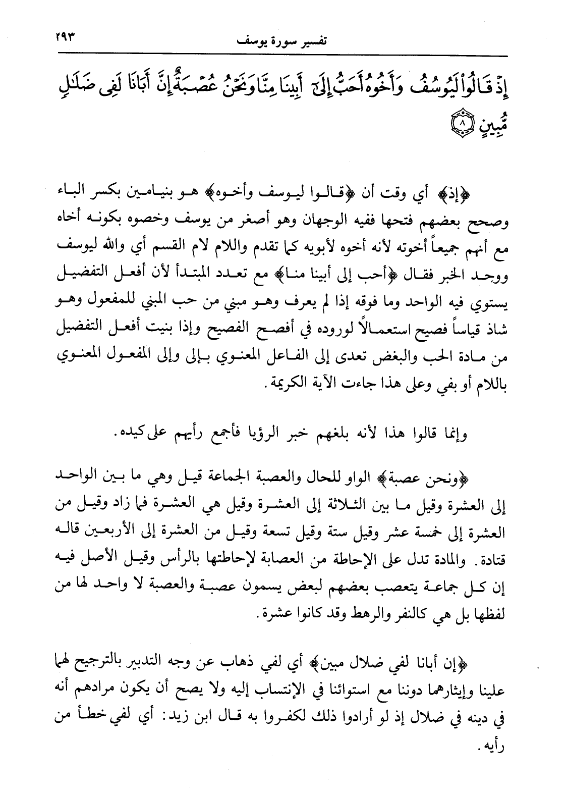 إِذْ قَالُوا لَيُوسُفُ وَأَخُوهُ أَحَبُّ إِلَى أَبِينَا مِنَّا وَنَحْنُ عُصْبَةٌ إِنَّ أَبَانَا لَفِي ضَلَالٍ مُبِينٍ (8)