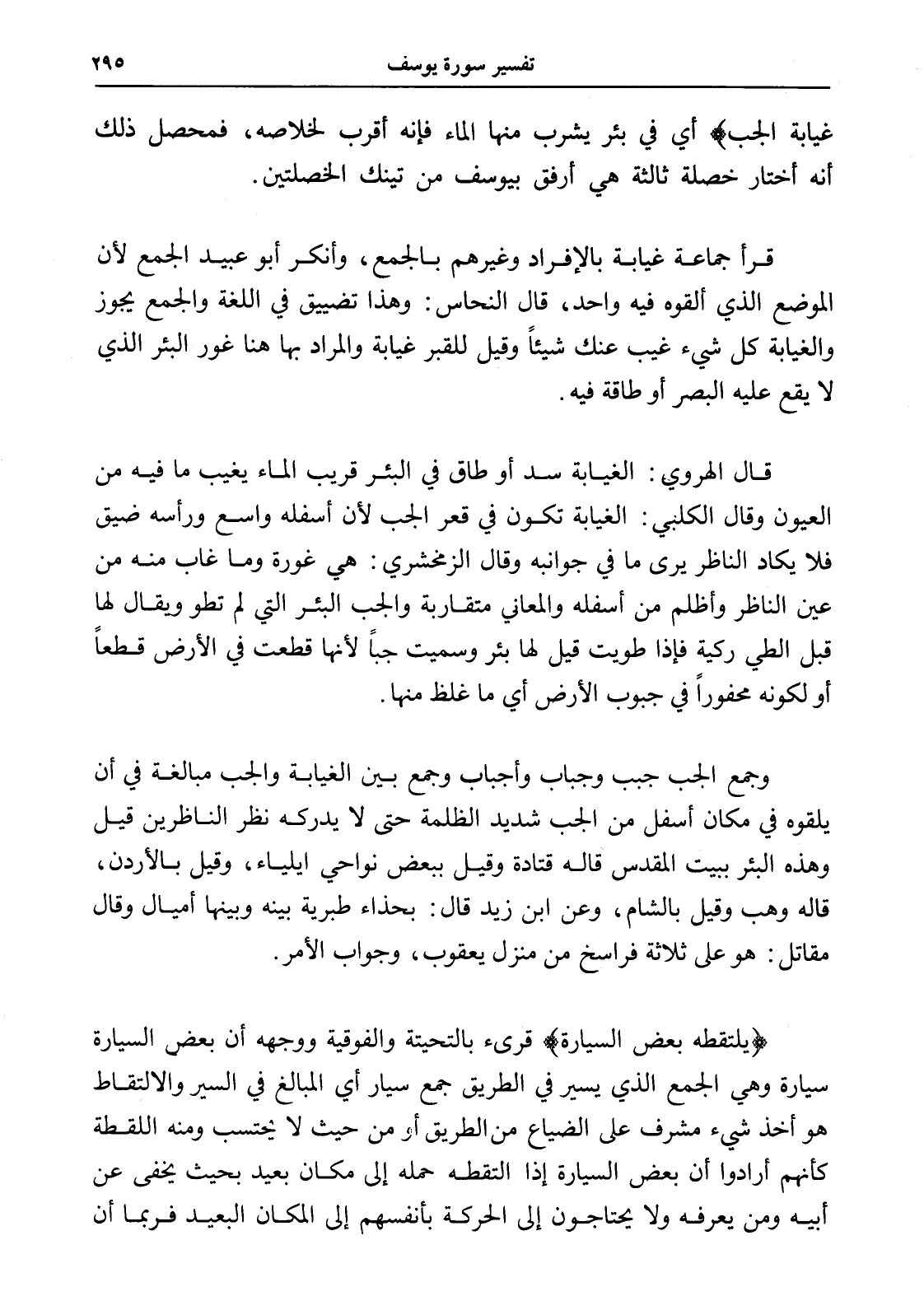 قال الهروي: الغيابة سد أو طاق في البئر قريب الماء يغيب ما فيه من العيون وقال الكلبي: الغيابة تكون في قعر الجب لأن أسفله واسع ورأسه ضيق فلا يكاد الناظر يرى ما في جوانبه وقال الزمخشري: هي غورة وما غاب منه من عين الناظر وأظلم من أسفله والمعاني متقاربة والجب البئر التي لم تطو ويقال لها قبل الطي ركية فإذا طويت قيل لها بئر وسميت جباً لأنها قطعت في الأرض قطعاً أو لكونه محفوراً في جبوب الأرض أي ما غلظ منها.