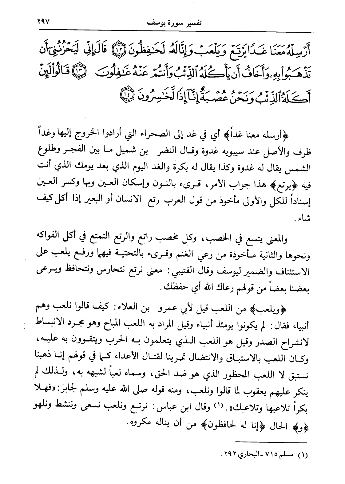 أَرْسِلْهُ مَعَنَا غَدًا يَرْتَعْ وَيَلْعَبْ وَإِنَّا لَهُ لَحَافِظُونَ (12) قَالَ إِنِّي لَيَحْزُنُنِي أَنْ تَذْهَبُوا بِهِ وَأَخَافُ أَنْ يَأْكُلَهُ الذِّئْبُ وَأَنْتُمْ عَنْهُ غَافِلُونَ (13) قَالُوا لَئِنْ أَكَلَهُ الذِّئْبُ وَنَحْنُ عُصْبَةٌ إِنَّا إِذًا لَخَاسِرُونَ (14)
