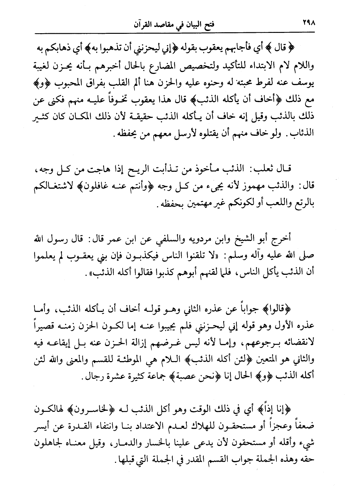 (قال) أي فأجابهم يعقوب بقوله (إني ليحزنني أن تذهبوا به) أي ذهابكم به واللام لام الابتداء للتأكيد ولتخصيص المضارع بالحال أخبرهم بأنه يحزن لغيبة يوسف عنه لفرط محبته له وحنوه عليه والحزن هنا الم القلب بفراق المحبوب (و) مع ذلك (أخاف أن يأكله الذئب) قال هذا يعقوب تخوفاً عليه منهم فكنى عن ذلك بالذئب وقيل إنه خاف أن يأكله الذئب حقيقة لأن ذلك المكان كان كثير الذئاب. ولو خاف منهم أن يقتلوه لأرسل معهم من يحفظه.