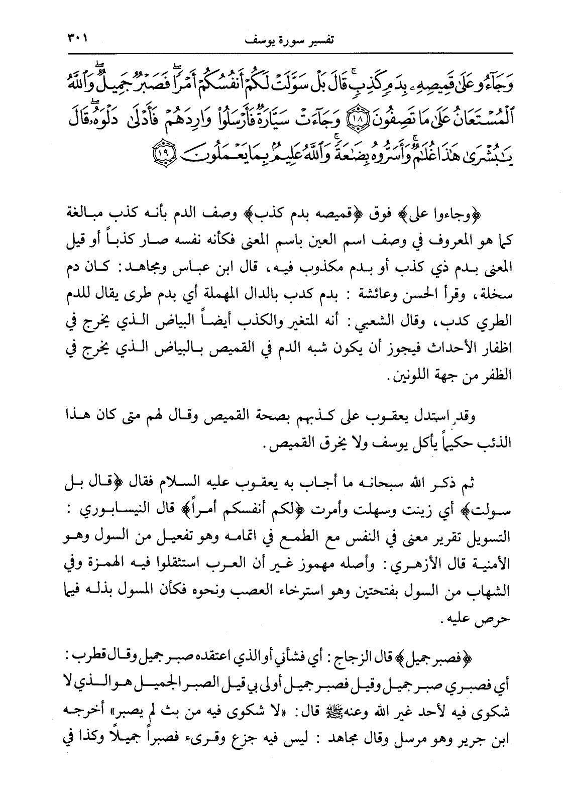 وَجَاءُوا عَلَى قَمِيصِهِ بِدَمٍ كَذِبٍ قَالَ بَلْ سَوَّلَتْ لَكُمْ أَنْفُسُكُمْ أَمْرًا فَصَبْرٌ جَمِيلٌ وَاللَّهُ الْمُسْتَعَانُ عَلَى مَا تَصِفُونَ (18) وَجَاءَتْ سَيَّارَةٌ فَأَرْسَلُوا وَارِدَهُمْ فَأَدْلَى دَلْوَهُ قَالَ يَا بُشْرَى هَذَا غُلَامٌ وَأَسَرُّوهُ بِضَاعَةً وَاللَّهُ عَلِيمٌ بِمَا يَعْمَلُونَ (19)