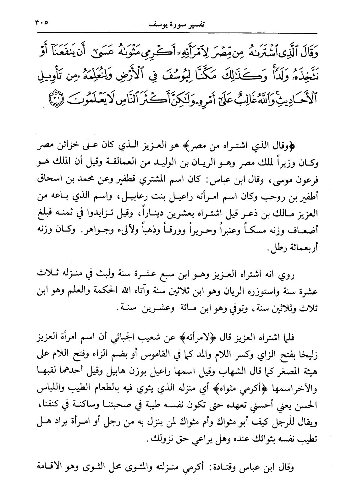 (وقال الذي اشتراه من مصر) هو العزيز الذي كان على خزائن مصر وكان وزيراً لملك مصر وهو الريان بن الوليد من العمالقة وقيل أن الملك هو فرعون موسى، وقال ابن عباس: كان اسم المشتري قطفير وعن محمد بن إسحاق أطفير بن روحب وكان اسم امرأته راعيل بنت رعابيل، واسم الذي باعه من العزيز مالك بن ذعر قيل اشتراه بعشرين ديناراً، وقيل تزايدوا في ثمنه فبلغ أضعاف وزنه مسكاً وعنبراً وحريراً وورقاً وذهباً ولآلئ وجواهر. وكان وزنه أربعمائة رطل.