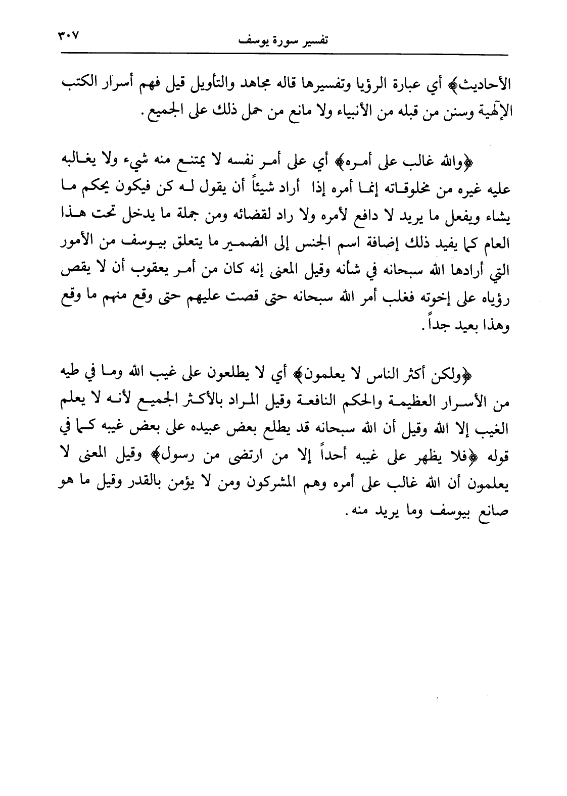 (ولكن أكثر الناس لا يعلمون) أي لا يطلعون على غيب الله وما في طيه من الأسرار العظيمة والحكم النافعة وقيل المراد بالأكثر الجميع لأنه لا يعلم الغيب إلا الله وقيل أن الله سبحانه قد يطلع بعض عبيده على بعض غيبه كما في قوله (فلا يظهر على غيبه أحداً إلا من ارتضى من رسول) وقيل المعنى لا يعلمون أن الله غالب على أمره وهم المشركون ومن لا يؤمن بالقدر وقيل ما هو صانع بيوسف وما يريد منه.