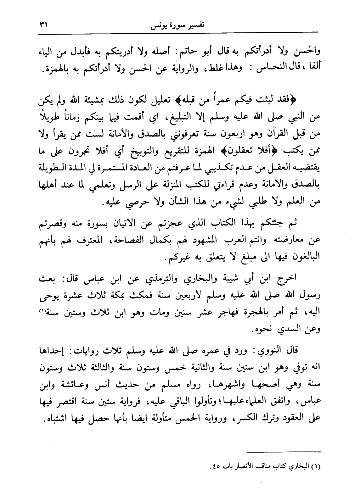 (فقد لبثت فيكم عمراً من قبله) تعليل لكون ذلك بمشيئة الله ولم يكن من النبي صلى الله عليه وسلم إلا التبليغ، أي أقمت فيما بينكم زماناً طويلاً من قبل القرآن وهو أربعون سنة تعرفونني بالصدق والأمانة لست ممن يقرأ ولا ممن يكتب (أفلا تعقلون) الهمزة للتقريع والتوبيخ أي أفلا تجرون على ما يقتضيه العقل من عدم تكذيبي لما عرفتم من العادة المستمرة لي المدة الطويلة بالصدق والأمانة وعدم قراءتي للكتب المنزلة على الرسل وتعلمي لما عند أهلها من العلم ولا طلبي لشيء من هذا الشأن ولا حرصي عليه.