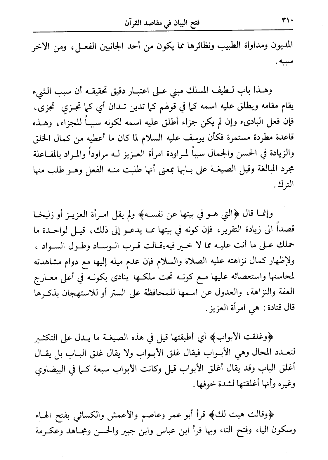وإنما قال (التي هو في بيتها عن نفسه) ولم يقل امرأة العزيز أو زليخا قصداً إلى زيادة التقرير، فإن كونه في بيتها مما يدعو إلى ذلك، قيل لواحدة ما حملك على ما أنت عليه مما لا خير فيه: قالت قرب الوساد وطول السواد، ولإظهار كمال نزاهته عليه الصلاة والسلام فإن عدم ميله إليها مع دوام مشاهدته لمحاسنها واستعصائه عليها مع كونه تحت ملكها ينادى بكونه في أعلى معارج العفة والنزاهة، والعدول عن اسمها للمحافظة على الستر أو للاستهجان بذكرها قال قتادة: هي امرأة العزيز.