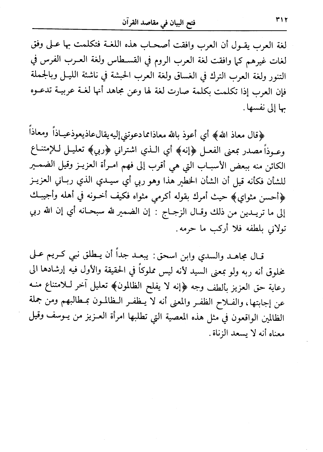 قال مجاهد والسدي وابن اسحق: يبعد جداً أن يطلق نبي كريم على مخلوق أنه ربه ولو بمعنى السيد لأنه ليس مملوكاً في الحقيقة والأول فيه إرشادها إلى رعاية حق العزيز بألطف وجه (إنه لا يفلح الظالمون) تعليل آخر للامتناع منه عن إجابتها، والفلاح الظفر والمعنى أنه لا يظفر الظالمون بمطالبهم ومن جملة الظالمين الواقعون في مثل هذه المعصية التي تطلبها امرأة العزيز من يوسف وقيل معناه أنه لا يسعد الزناة.