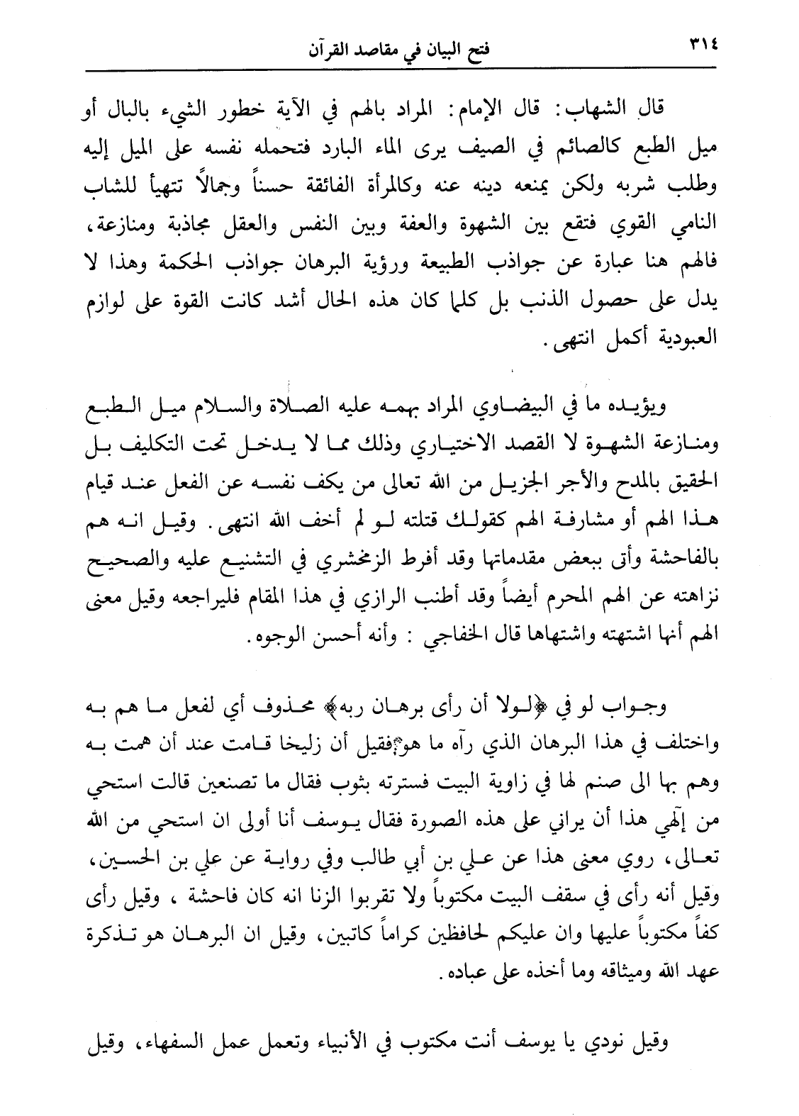 قال الشهاب: قال الإمام: المراد بالهم في الآية خطور الشيء بالبال أو ميل الطبع كالصائم في الصيف يرى الماء البارد فتحمله نفسه على الميل إليه وطلب شربه ولكن يمنعه دينه عنه وكالمرأة الفائقة حسناً وجمالاً تتهيأ للشاب النامي القوي فتقع بين الشهوة والعفة وبين النفس والعقل مجاذبة ومنازعة، فالهم هنا عبارة عن جواذب الطبيعة ورؤية البرهان جواذب الحكمة وهذا لا يدل على حصول الذنب بل كلما كان هذه الحال أشد كانت القوة على لوازم العبودية أكمل انتهى.
