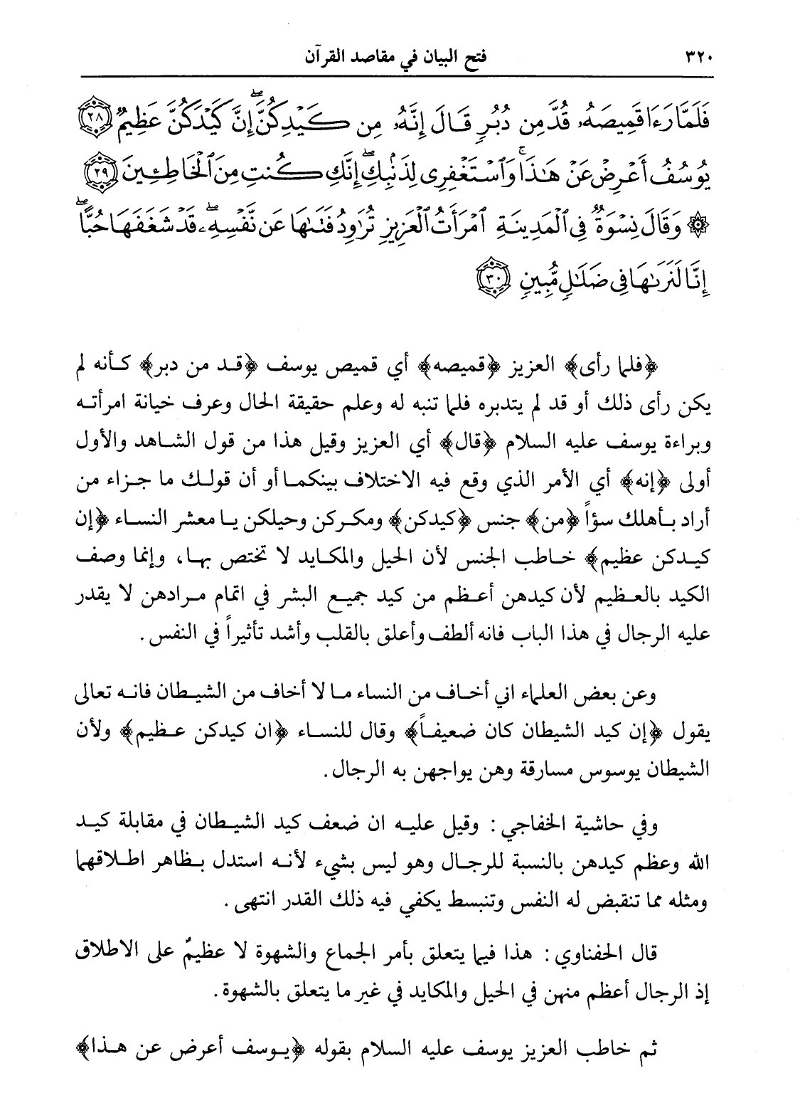 فَلَمَّا رَأَى قَمِيصَهُ قُدَّ مِنْ دُبُرٍ قَالَ إِنَّهُ مِنْ كَيْدِكُنَّ إِنَّ كَيْدَكُنَّ عَظِيمٌ (28) يُوسُفُ أَعْرِضْ عَنْ هَذَا وَاسْتَغْفِرِي لِذَنْبِكِ إِنَّكِ كُنْتِ مِنَ الْخَاطِئِينَ (29) وَقَالَ نِسْوَةٌ فِي الْمَدِينَةِ امْرَأَتُ الْعَزِيزِ تُرَاوِدُ فَتَاهَا عَنْ نَفْسِهِ قَدْ شَغَفَهَا حُبًّا إِنَّا لَنَرَاهَا فِي ضَلَالٍ مُبِينٍ (30)