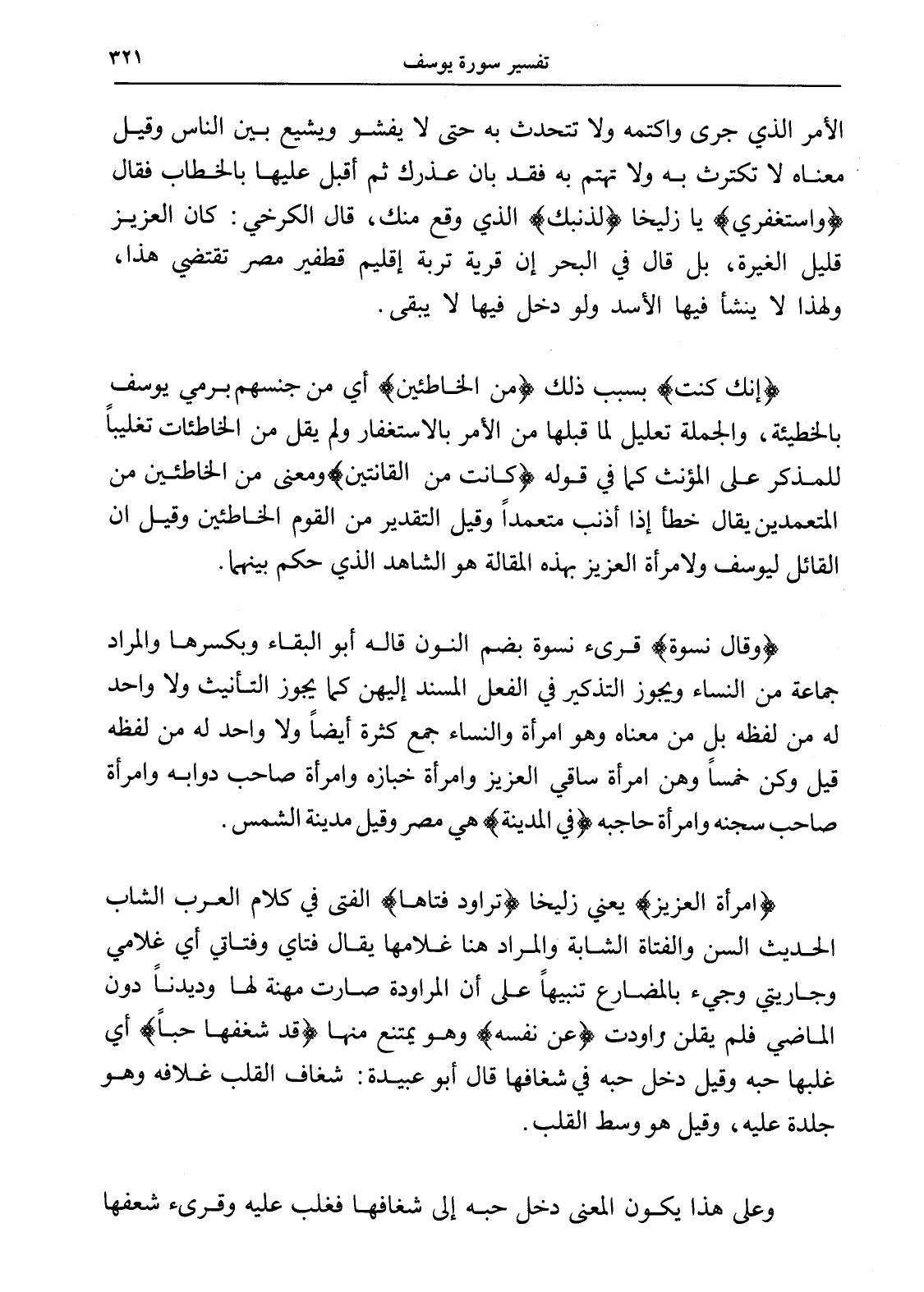 الأمر الذي جرى واكتمه ولا تتحدث به حتى لا يفشو ويشيع بين الناس وقيل ْمعناه لا تكترث به ولا تهتم به فقد بأن عذرك ثم أقبل عليها بالخطاب فقال (واستغفري) يا زليخا (لذنبك) الذي وقع منك، قال الكرخي: كان العزيز قليل الغيرة، بل قال في البحر إن قرية تربة إقليم قطفير مصر تقتضي هذا، ولهذا لا ينشأ فيها الأسد ولو دخل فيها لا يبقى.
