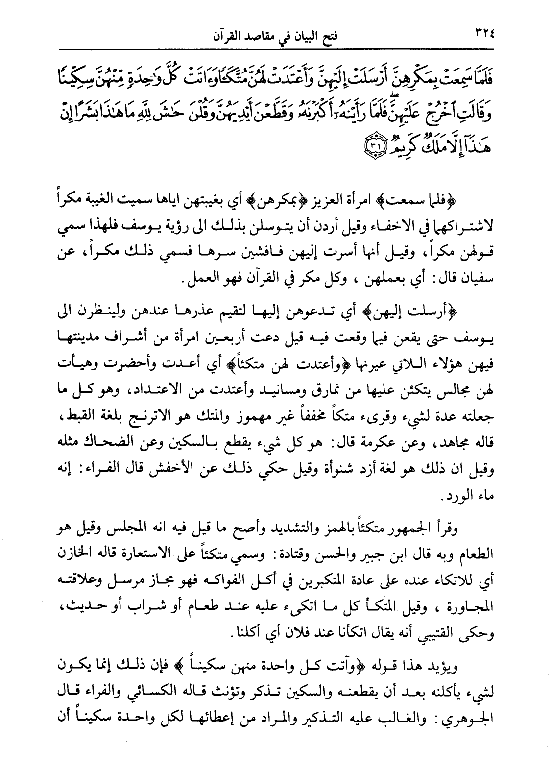 فَلَمَّا سَمِعَتْ بِمَكْرِهِنَّ أَرْسَلَتْ إِلَيْهِنَّ وَأَعْتَدَتْ لَهُنَّ مُتَّكَأً وَآتَتْ كُلَّ وَاحِدَةٍ مِنْهُنَّ سِكِّينًا وَقَالَتِ اخْرُجْ عَلَيْهِنَّ فَلَمَّا رَأَيْنَهُ أَكْبَرْنَهُ وَقَطَّعْنَ أَيْدِيَهُنَّ وَقُلْنَ حَاشَ لِلَّهِ مَا هَذَا بَشَرًا إِنْ هَذَا إِلَّا مَلَكٌ كَرِيمٌ (31)