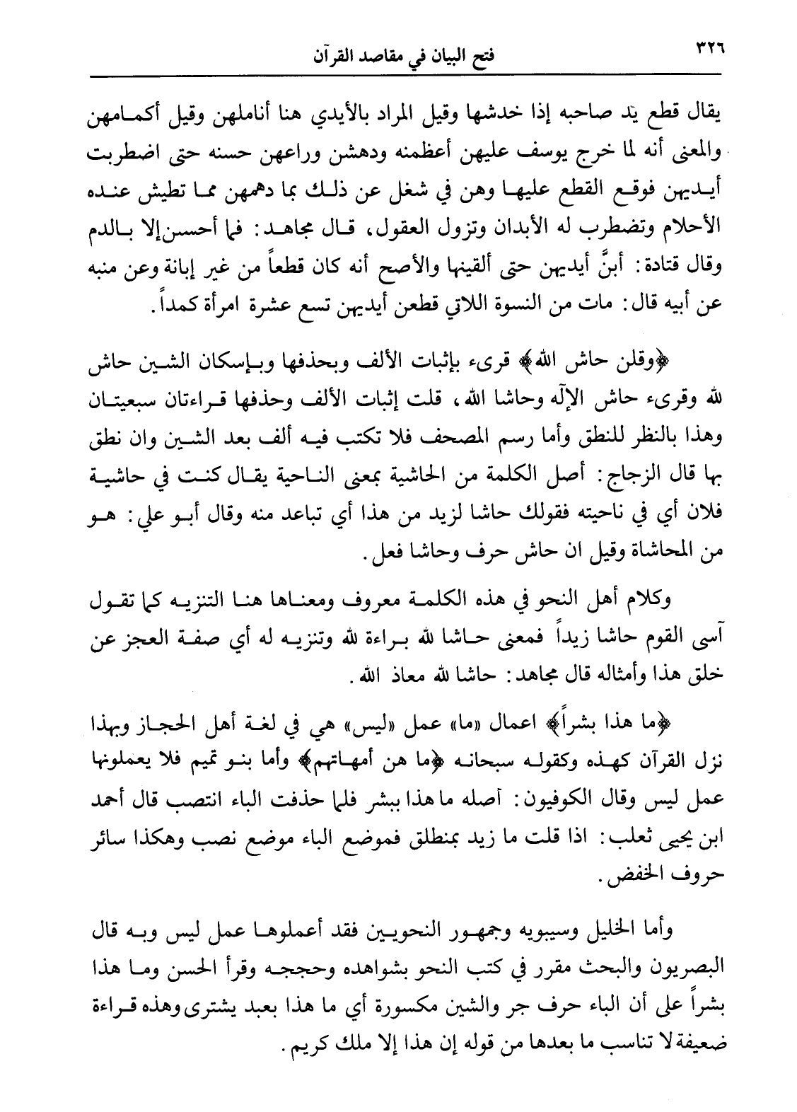 وأما الخليل وسيبويه وجمهور النحويين فقد أعملوها عمل ليس وبه قال البصريون والبحث مقرر في كتب النحو بشواهده وحججه وقرأ الحسن وما هذا بشراً على أن الباء حرف جر والشين مكسورة أي ما هذا بعبد يشترى وهذه قراءة ضعيفة لا تناسب ما بعدها من قوله إن هذا إلا ملك كريم.
