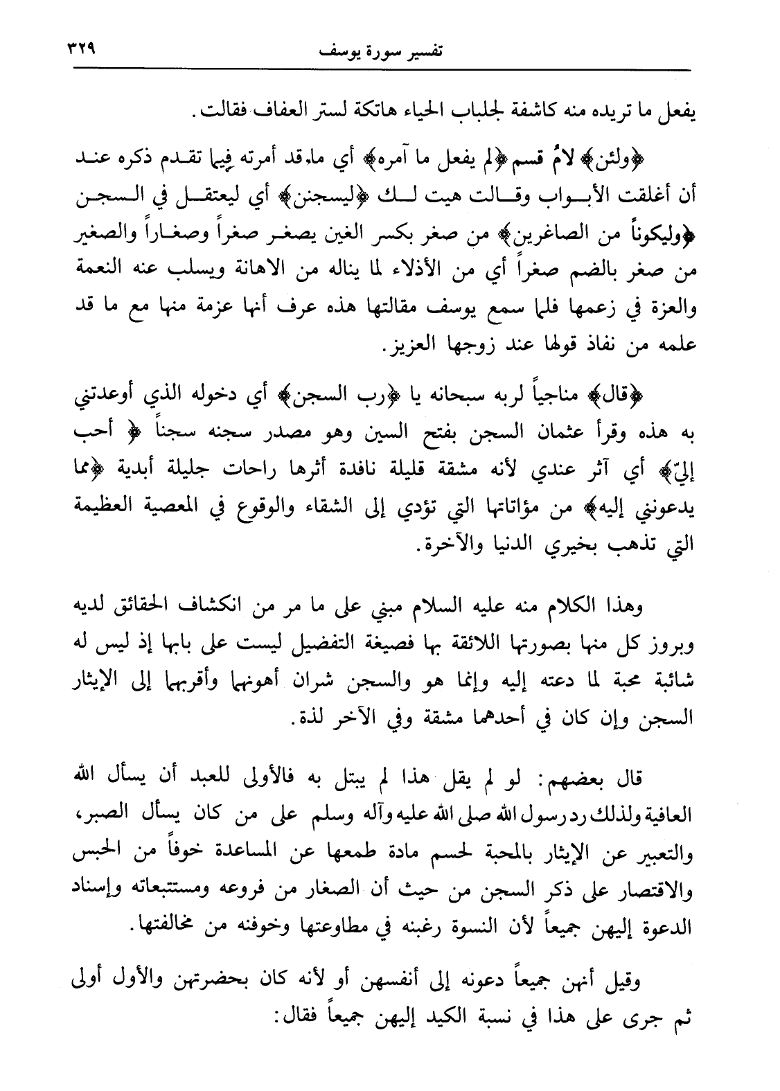 قال بعضهم: لو لم يقل هذا لم يبتل به فالأولى للعبد أن يسأل الله العافية ولذلك رد رسول الله صلى الله عليه وآله وسلم على من كان يسأل الصبر، والتعبير عن الإيثار بالمحبة لحسم مادة طمعها عن المساعدة خوفاً من الحبس والاقتصار على ذكر السجن من حيث أن الصغار من فروعه ومستتبعاته وإسناد الدعوة إليهن جميعاً لأن النسوة رغبنه في مطاوعتها وخوفنه من مخالفتها.