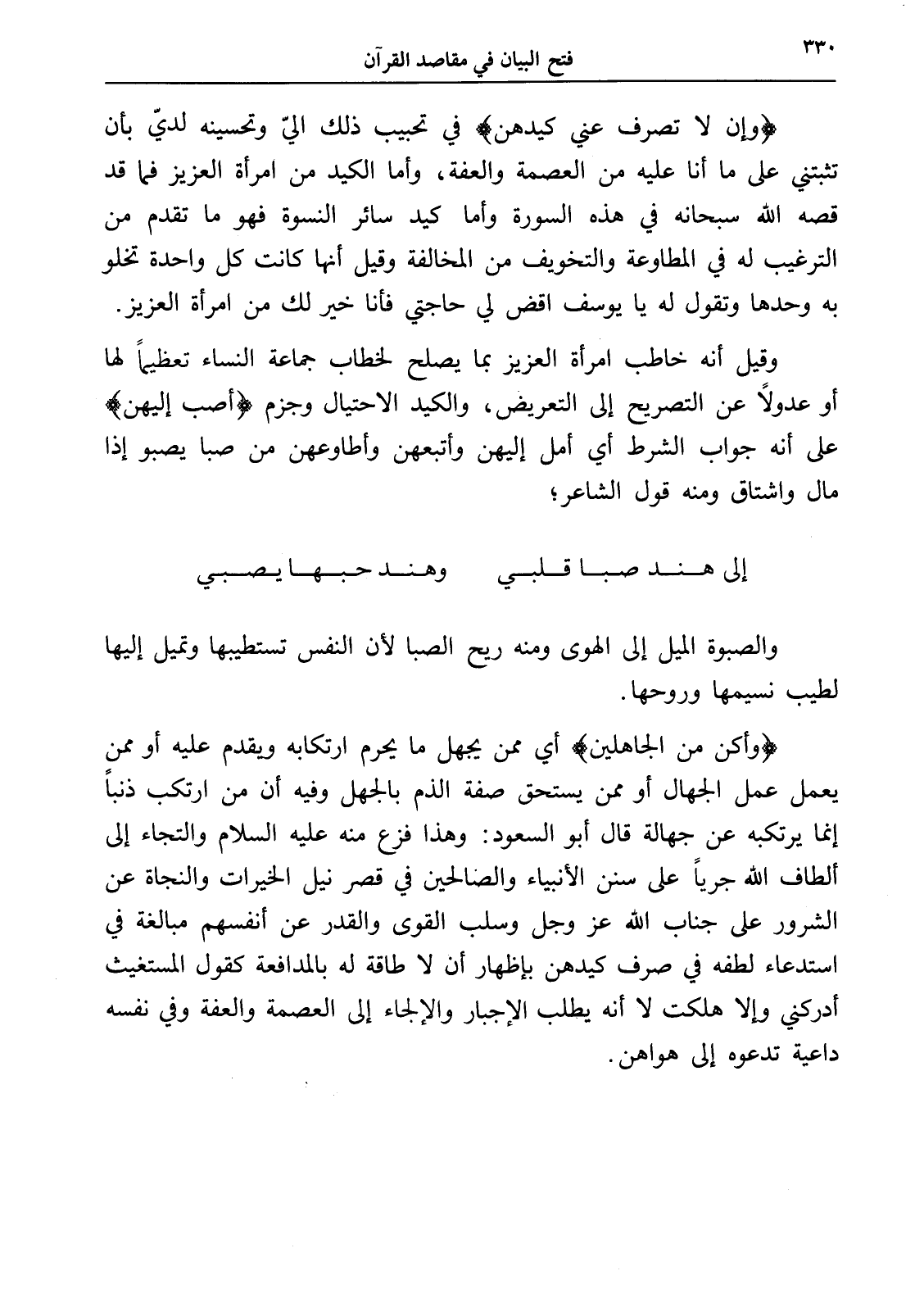 وقيل أنه خاطب امرأة العزيز بما يصلح لخطاب جماعة النساء تعظيماً لها أو عدولاً عن التصريح إلى التعريض، والكيد الاحتيال وجزم (أصب إليهن) على أنه جواب الشرط أي أمل إليهن وأتبعهن وأطاوعهن من صبا يصبو إذا مال واشتاق ومنه قول الشاعر؛