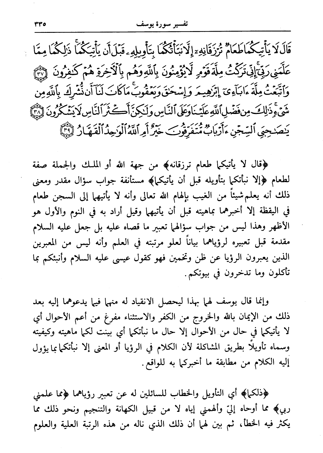 قَالَ لَا يَأْتِيكُمَا طَعَامٌ تُرْزَقَانِهِ إِلَّا نَبَّأْتُكُمَا بِتَأْوِيلِهِ قَبْلَ أَنْ يَأْتِيَكُمَا ذَلِكُمَا مِمَّا عَلَّمَنِي رَبِّي إِنِّي تَرَكْتُ مِلَّةَ قَوْمٍ لَا يُؤْمِنُونَ بِاللَّهِ وَهُمْ بِالْآخِرَةِ هُمْ كَافِرُونَ (37) وَاتَّبَعْتُ مِلَّةَ آبَائِي إِبْرَاهِيمَ وَإِسْحَاقَ وَيَعْقُوبَ مَا كَانَ لَنَا أَنْ نُشْرِكَ بِاللَّهِ مِنْ شَيْءٍ ذَلِكَ مِنْ فَضْلِ اللَّهِ عَلَيْنَا وَعَلَى النَّاسِ وَلَكِنَّ أَكْثَرَ النَّاسِ لَا يَشْكُرُونَ (38) يَا صَاحِبَيِ السِّجْنِ أَأَرْبَابٌ مُتَفَرِّقُونَ خَيْرٌ أَمِ اللَّهُ الْوَاحِدُ الْقَهَّارُ (39)