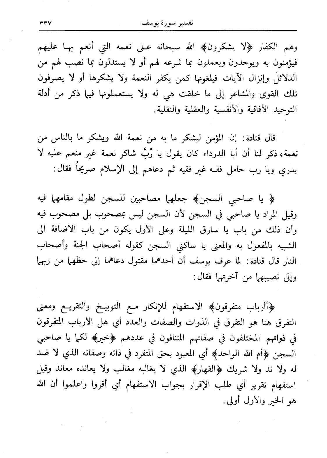 (أأرباب متفرقون) الاستفهام للإنكار مع التوبيخ والتقريع ومعنى التفرق هنا هو التفرق في الذوات والصفات والعدد أي هل الأرباب المتفرقون في ذواتهم المختلفون في صفاتهم المتنافون في عددهم (خير) لكما يا صاحبي السجن (أم الله الواحد) أي المعبود بحق المتفرد في ذاته وصفاته الذي لا ضد له ولا ند ولا شريك (القهار) الذي لا يغالبه مغالب ولا يعانده معاند وقيل استفهام تقرير أي طلب الإقرار بجواب الاستفهام أي أقروا واعلموا أن الله هو الخير والأول أولى.