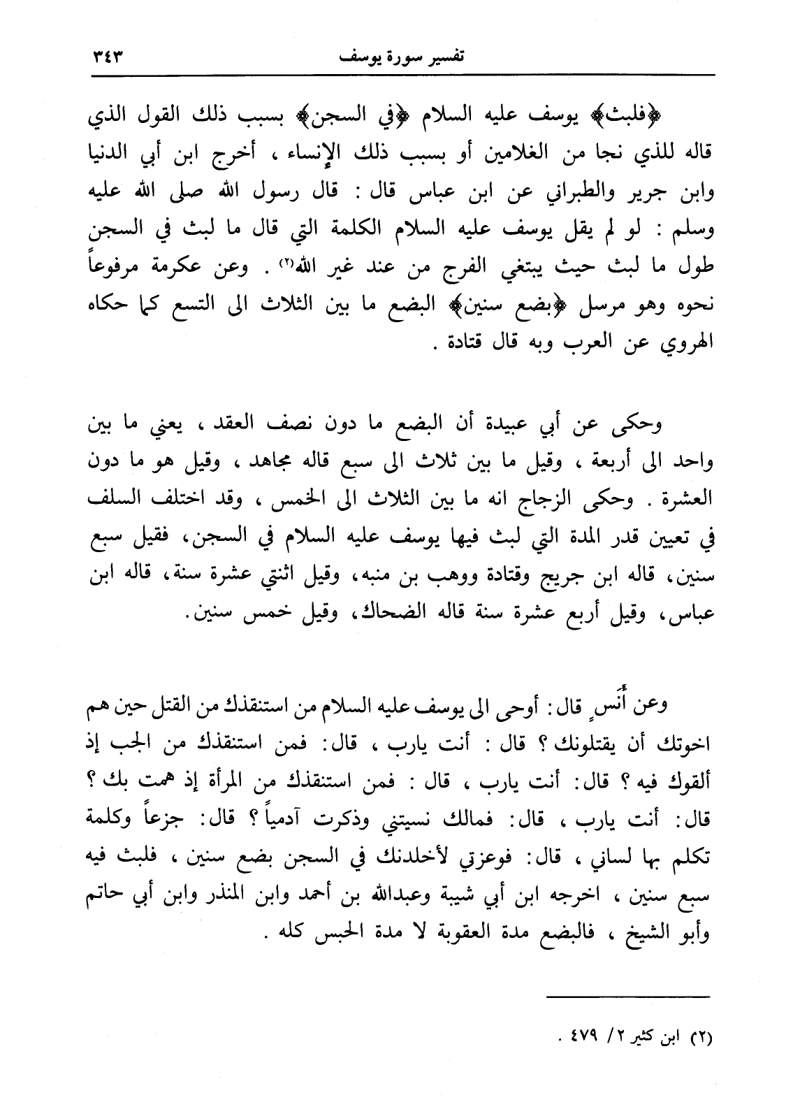 وعن أنس قال: أوحي إلى يوسف عليه السلام من استنقذك من القتل حين هم إخوتك أن يقتلونك؟ قال: أنت يا رب، قال: فمن استنقذك من الجب إذ ألقوك فيه؟ قال: أنت يا رب، قال: فمن استنقذك من المرأة إذ همت بك؟ قال: أنت يا رب، قال: فما لك نسيتني وذكرت آدمياً؟ قال: جزعاً وكلمة تكلم بها لساني، قال: فوعزتي لأخلدنك في السجن بضع سنين، فلبث فيه سبع سنين، أخرجه ابن أبي شيبة وعبد الله بن أحمد وابن المنذر وابن أبي حاتم وأبو الشيخ، فالبضع مدة العقوبة لا مدة الحبس كله.