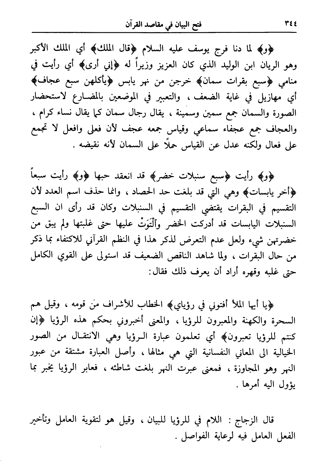 (و) لما دنا فرج يوسف عليه السلام (قال الملك) أي الملك الأكبر وهو الريان ابن الوليد الذي كان العزيز وزيراً له (إني أرى) أي رأيت في منامي (سبع بقرات سمان) خرجن من نهر يابس (يأكلهن سبع عجاف) أي مهازيل في غاية الضعف، والتعبير في الموضعين بالمضارع لاستحضار الصورة والسمان جمع سمين وسمينة، يقال رجال سمان كما يقال نساء كرام، والعجاف جمع عجفاء سماعي وقياس جمعه عجف لأن فعلى وافعل لا تجمع على فعال ولكنه عدل عن القياس حملاً على السمان لأنه نقيضه.