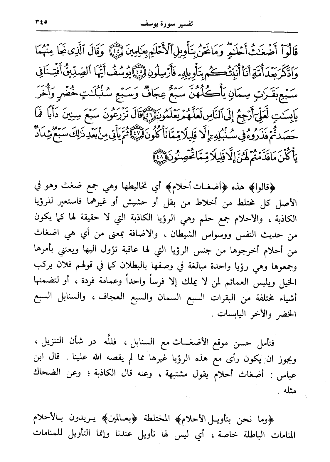 قَالُوا أَضْغَاثُ أَحْلَامٍ وَمَا نَحْنُ بِتَأْوِيلِ الْأَحْلَامِ بِعَالِمِينَ (44) وَقَالَ الَّذِي نَجَا مِنْهُمَا وَادَّكَرَ بَعْدَ أُمَّةٍ أَنَا أُنَبِّئُكُمْ بِتَأْوِيلِهِ فَأَرْسِلُونِ (45) يُوسُفُ أَيُّهَا الصِّدِّيقُ أَفْتِنَا فِي سَبْعِ بَقَرَاتٍ سِمَانٍ يَأْكُلُهُنَّ سَبْعٌ عِجَافٌ وَسَبْعِ سُنْبُلَاتٍ خُضْرٍ وَأُخَرَ يَابِسَاتٍ لَعَلِّي أَرْجِعُ إِلَى النَّاسِ لَعَلَّهُمْ يَعْلَمُونَ (46) قَالَ تَزْرَعُونَ سَبْعَ سِنِينَ دَأَبًا فَمَا حَصَدْتُمْ فَذَرُوهُ فِي سُنْبُلِهِ إِلَّا قَلِيلًا مِمَّا تَأْكُلُونَ (47) ثُمَّ يَأْتِي مِنْ بَعْدِ ذَلِكَ سَبْعٌ شِدَادٌ يَأْكُلْنَ مَا قَدَّمْتُمْ لَهُنَّ إِلَّا قَلِيلًا مِمَّا تُحْصِنُونَ (48)