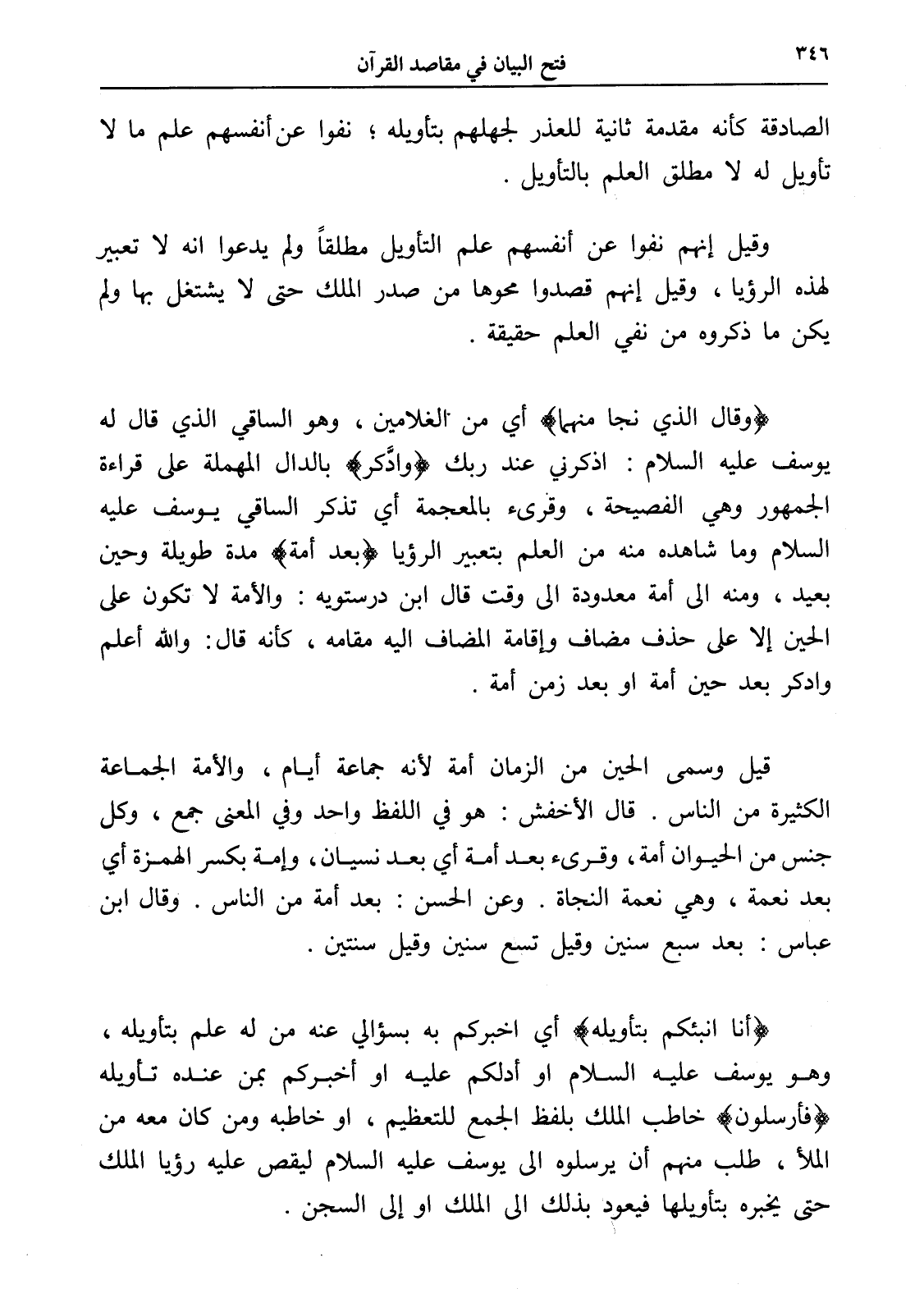 (وقال الذي نجا منهما) أي من الغلامين، وهو الساقي الذي قال له يوسف عليه السلام: اذكرني عند ربك (وادَّكر) بالدال المهملة على قراءة الجمهور وهي الفصيحة، وقرئ بالمعجمة أي تذكر الساقي يوسف عليه السلام وما شاهده منه من العلم بتعبير الرؤيا (بعد أمة) مدة طويلة وحين بعيد، ومنه إلى أمة معدودة إلى وقت قال ابن درستويه: والأمة لا تكون على الحين إلا على حذف مضاف وإقامة المضاف إليه مقامه، كأنه قال: والله أعلم وادكر بعد حين أمة أو بعد زمن أمة.