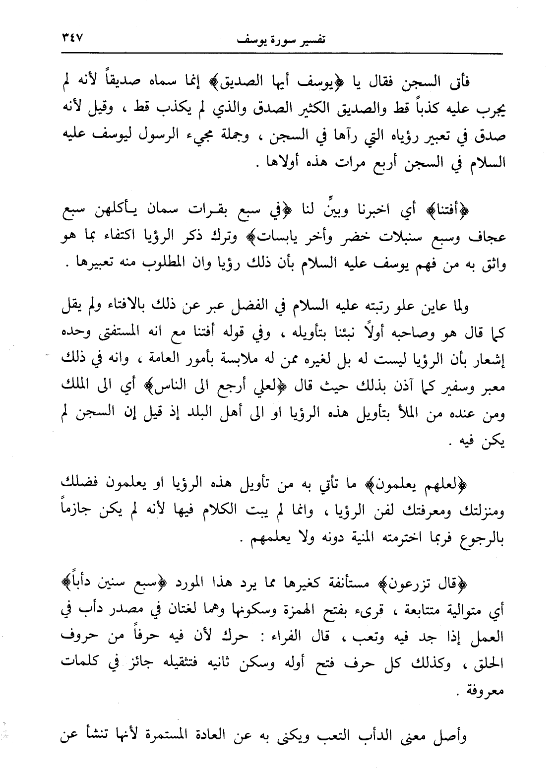 (قال تزرعون) مستأنفة كغيرها مما يرد هذا المورد (سبع سنين دأباً) أي متوالية متتابعة، قرئ بفتح الهمزة وسكونها وهما لغتان في مصدر دأب في العمل إذا جد فيه وتعب، قال الفراء: حرك لأن فيه حرفاً من حروف الحلق، وكذلك كل حرف فتح أوله وسكن ثانيه فتثقيله جائز في كلمات معروفة.