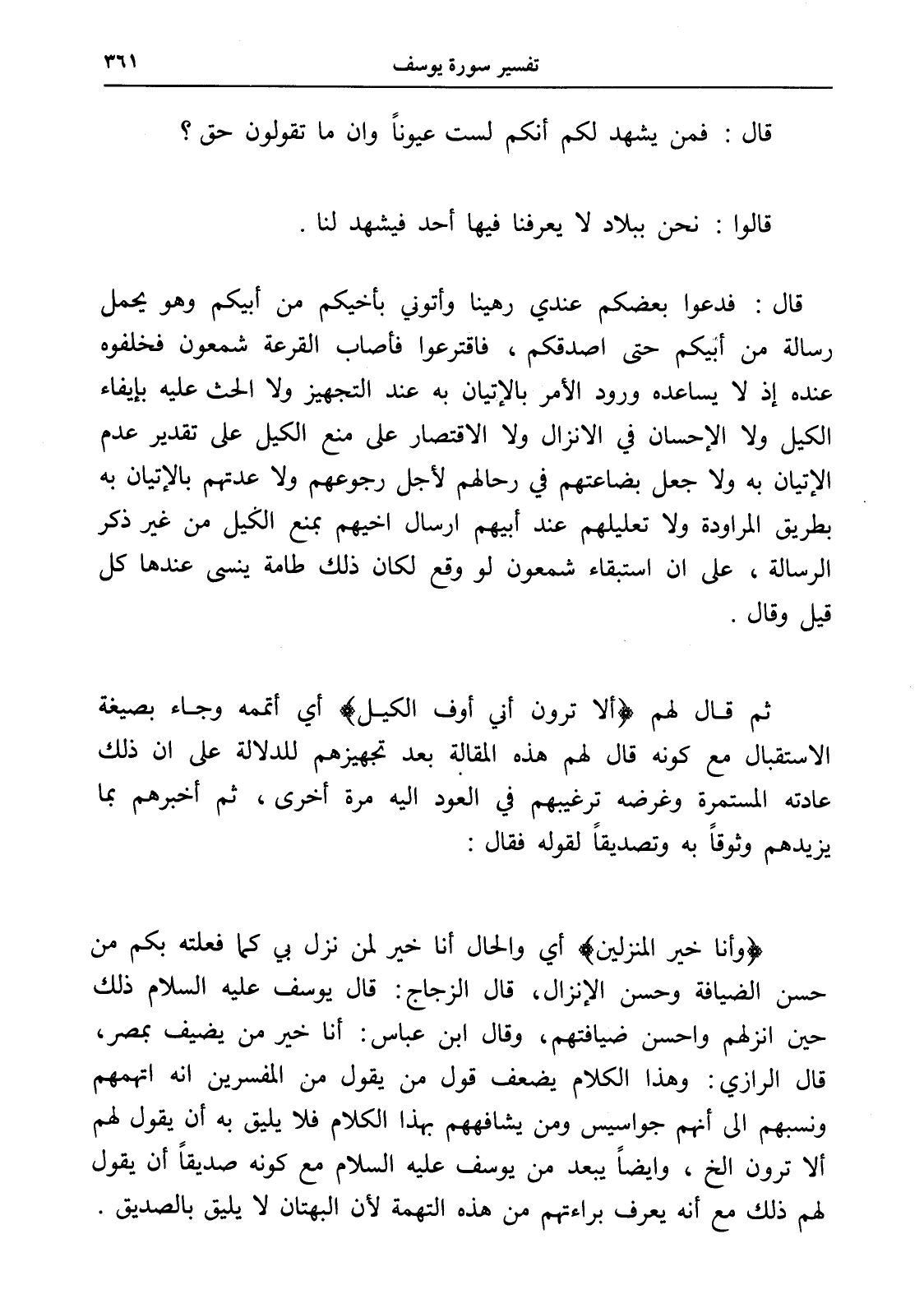 قال: فدعوا بعضكم عندي رهينا وأتوني بأخيكم من أبيكم وهو يحمل رسالة من أبيكم حتى أصدقكم، فاقترعوا فأصاب القرعة شمعون فخلفوه عنده إذ لا يساعده ورود الأمر بالإتيان به عند التجهيز ولا الحث عليه بإيفاء الكيل ولا الإحسان في الإنزال ولا الاقتصار على منع الكيل على تقدير عدم الإتيان به ولا جعل بضاعتهم في رحالهم لأجل رجوعهم ولا عدتهم بالإتيان به بطريق المراودة ولا تعليلهم عند أبيهم إرسال أخيهم بمنع الكيل من غير ذكر الرسالة، على أن استبقاء شمعون لو وقع لكان ذلك طامة ينسى عندها كل قيل وقال.