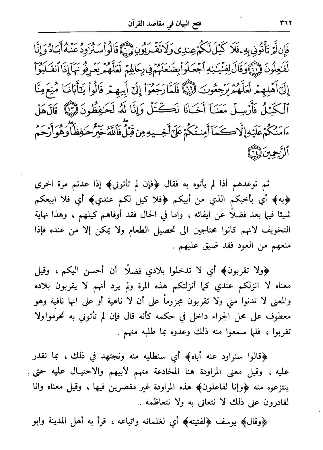 فَإِنْ لَمْ تَأْتُونِي بِهِ فَلَا كَيْلَ لَكُمْ عِنْدِي وَلَا تَقْرَبُونِ (60) قَالُوا سَنُرَاوِدُ عَنْهُ أَبَاهُ وَإِنَّا لَفَاعِلُونَ (61) وَقَالَ لِفِتْيَانِهِ اجْعَلُوا بِضَاعَتَهُمْ فِي رِحَالِهِمْ لَعَلَّهُمْ يَعْرِفُونَهَا إِذَا انْقَلَبُوا إِلَى أَهْلِهِمْ لَعَلَّهُمْ يَرْجِعُونَ (62) فَلَمَّا رَجَعُوا إِلَى أَبِيهِمْ قَالُوا يَا أَبَانَا مُنِعَ مِنَّا الْكَيْلُ فَأَرْسِلْ مَعَنَا أَخَانَا نَكْتَلْ وَإِنَّا لَهُ لَحَافِظُونَ (63) قَالَ هَلْ آمَنُكُمْ عَلَيْهِ إِلَّا كَمَا أَمِنْتُكُمْ عَلَى أَخِيهِ مِنْ قَبْلُ فَاللَّهُ خَيْرٌ حَافِظًا وَهُوَ أَرْحَمُ الرَّاحِمِينَ (64)